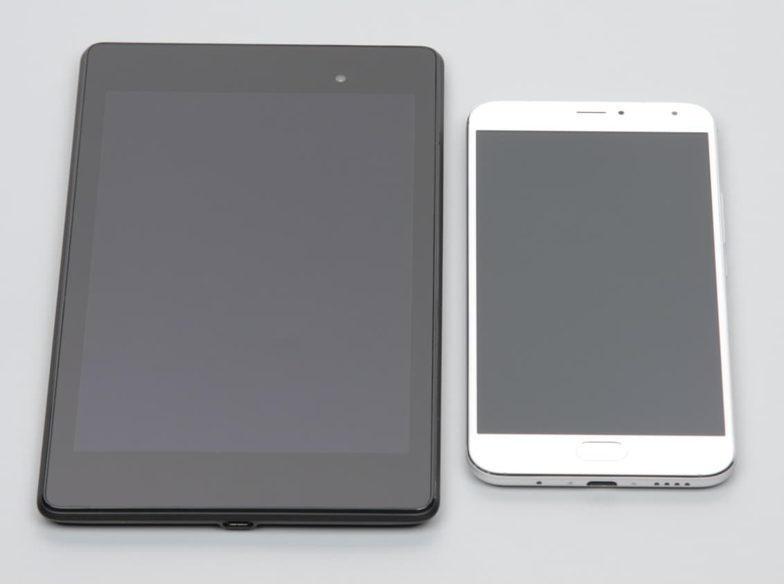Лицевая поверхность экрана выполнена в виде стеклянной пластины с зеркально-гладкой поверхностью, устойчивой к появлению царапин. Судя по отражению объектов антибликовые свойства экрана не хуже, чем у экрана Google Nexus 7 (2013) (ниже просто Nexus 7). Для наглядности приведем фотографию, на которой в выключенных экранах отражается белая поверхность (слева — Nexus 7, справа — Meizu Pro 5, далее их можно различать по размеру):
