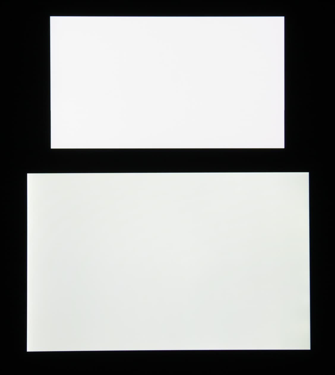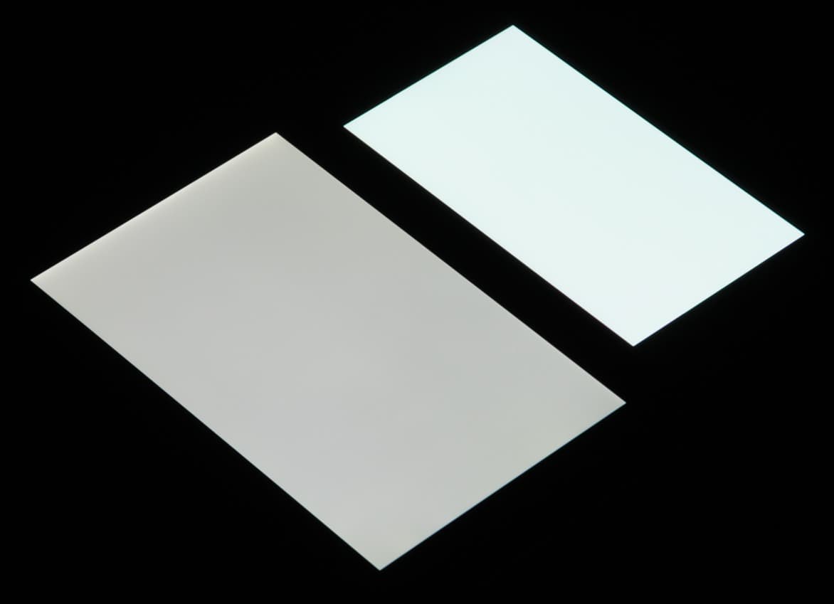 Экран характеризуется великолепными углами обзора. Правда, белый цвет при отклонении даже на небольшие углы приобретает легкий сине-зеленый оттенок, а под некоторыми углами чуть-чуть розовеет, но черный цвет остается черным под любыми углами. Он настолько черный, что параметр контрастности в данном случае просто неприменим. При перпендикулярном взгляде равномерность белого поля хорошая. Для сравнения приведем фотографии, на которых на экраны Meizu Pro 5 и второго участника сравнения выведены одинаковые изображения, при этом яркость экранов изначально установлена примерно на 200 кд/м², а цветовой баланс на фотоаппарате принудительно переключен на 6500 К. Перпендикулярно к экранам белое поле: