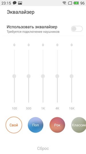 - Эквалайзер штатного плеера имеет слишком мало полос. Самый крайний движок (100 Гц) регулирует весь НЧ-диапазон. Недоработка.