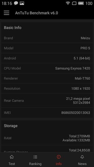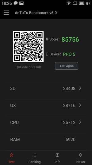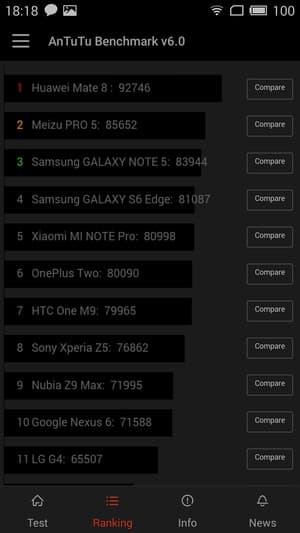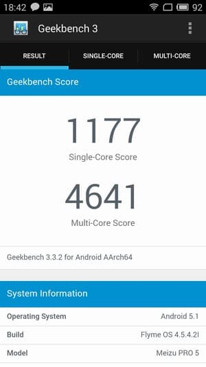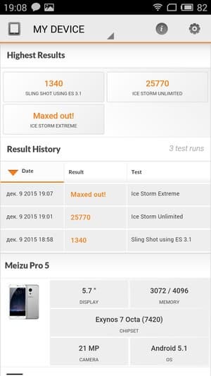 В качестве аппаратной платформы для Meizu Pro 5 была выбрана та же самая SoC, которая используется в показавших себя наиболее производительными на сегодняшний день смартфонах Samsung. Неудивительно, что и герой обзора, обладая такой производительной платформой, поднялся на верхние строчки рейтинга самых быстрых смартфонов современности. По результатам тестирований Meizu Pro 5 ожидаемо продемонстрировал практически максимальный на сегодняшний день уровень производительности. По рейтингу AnTuTu данный аппарат занимает 2-е место среди всех протестированных устройств.