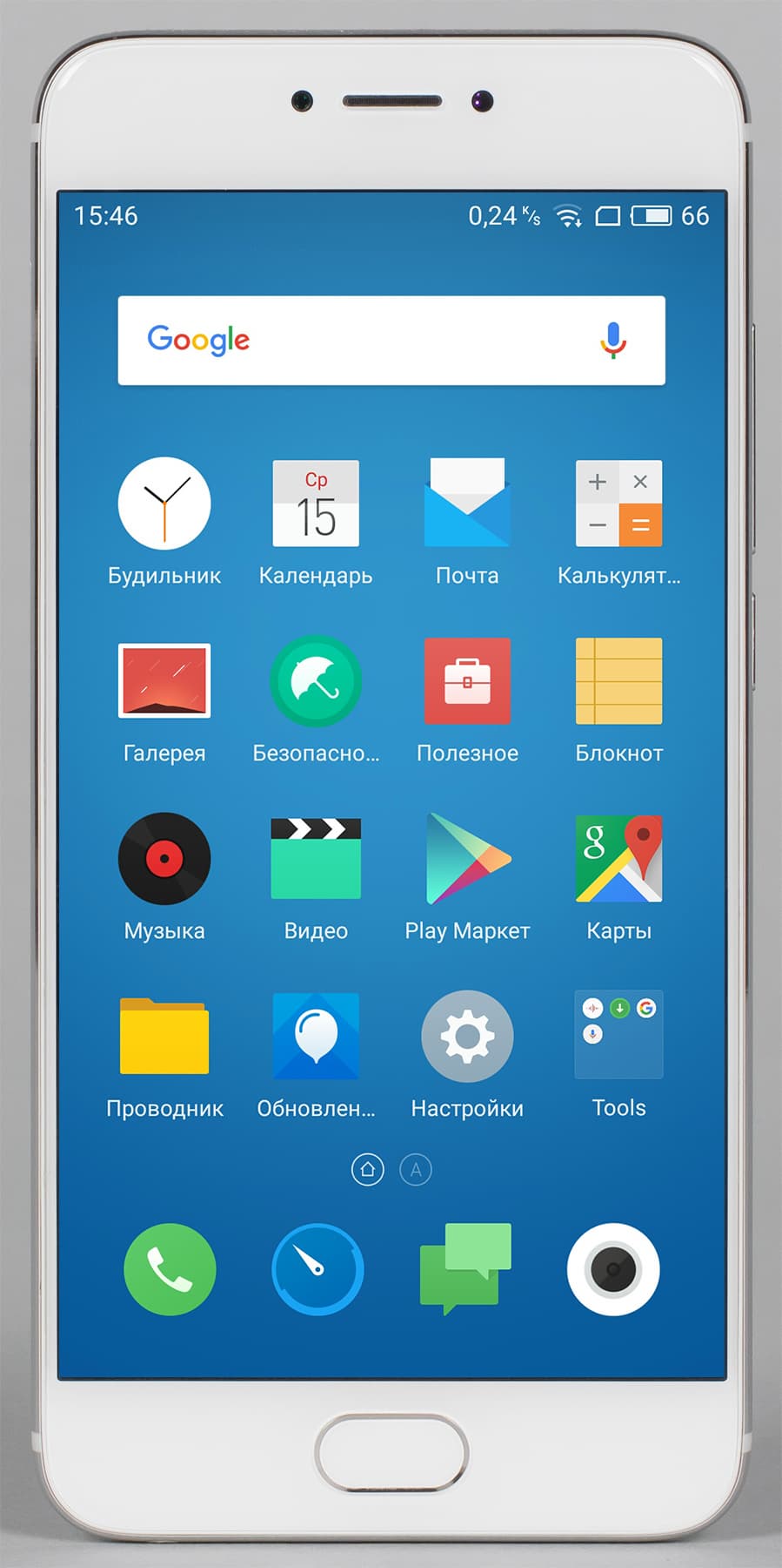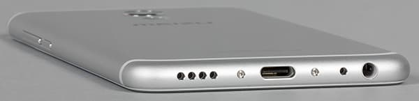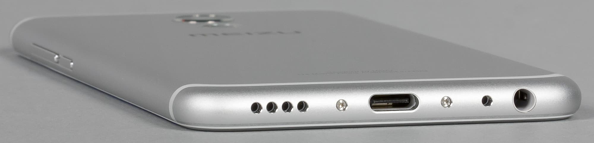 Динамик выведен в нижний торец, прикрывающая его решетка только одна, с другой стороны от центрального разъема Micro-USB типа С установлены разговорный микрофон и гнездо для наушников. Таким образом, Meizu в точности повторяет расстановку элементов в iPhone 6, у которого они также собраны на нижнем торце, а наверху ничего нет.