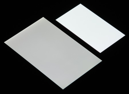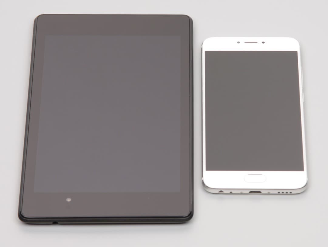 Лицевая поверхность экрана выполнена в виде стеклянной пластины с зеркально-гладкой поверхностью, устойчивой к появлению царапин. Судя по отражению объектов антибликовые свойства экрана лучше, чем у экрана Google Nexus 7 (2013) (ниже просто Nexus 7). Для наглядности приведем фотографию, на которой в выключенных экранах отражается белая поверхность (слева — Nexus 7, справа — Meizu Pro 6, далее их можно различать по размеру):