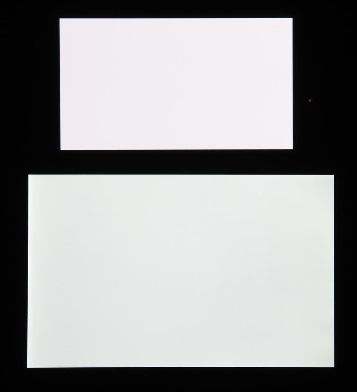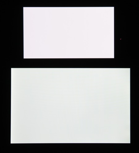 Экран характеризуется великолепными углами обзора, правда белый цвет при отклонении даже на небольшие углы приобретает легкий сине-зеленый оттенок, а под некоторыми углами чуть-чуть розовеет, но черный цвет остается просто черным под любыми углами. Он настолько черный, что параметр контрастности в данном случае просто неприменим. При перпендикулярном взгляде равномерность белого поля хорошая. Для сравнения приведем фотографии, на которых на экраны Meizu Pro 6 и второго участника сравнения выведены одинаковые изображения, при этом яркость экранов изначально установлена примерно на 200 кд/м², а цветовой баланс на фотоаппарате принудительно переключен на 6500 К. Перпендикулярно к экранам белое поле: