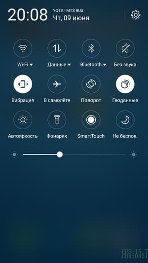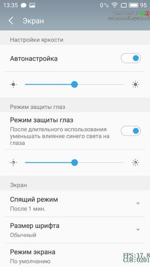 При ручном управлении яркостью и при выводе белого поля во весь экран максимальное значение яркости составило примерно 340 кд/м², минимальное — 3,3 кд/м². Максимальная яркость не очень высокая, но нужно учитывать отличные антибликовые свойства экрана и тот факт, что в режиме с автоматической подстройкой яркости яркость может быть выше (см. ниже). В итоге читаемость днем на солнце находится на достаточно хорошем уровне. Пониженный уровень яркости без проблем позволяет использовать устройство даже в полной темноте. Есть автоматическая регулировка яркости по датчику освещенности (он находится справа от прорези фронтального громкоговорителя). В автоматическом режиме при изменении внешних условий освещенности яркость экрана как повышается, так и понижается. Работа этой функции зависит от положения ползунка регулировки яркости. Если он на 100%, то в полной темноте функция автоматической подстройки яркости уменьшает яркость до 47 кд/м² (подходит), в условиях освещенного искусственным светом офиса (около 400 лк) устанавливает на 150 кд/м² (нормально), в очень ярком окружении (соответствует освещению ясным днем вне помещения, но без прямого солнечного света — 20000 лк или немного больше) повышает до максимума — до 350 кд/м² (чуть больше, чем при ручной регулировке), а если повысить яркость внешней засветки (в районе датчика освещенности) где-то до сотни тысяч люксов (соответствует прямому солнечному свету), то яркость экрана еще немного повышается — до 44 кд/м². Ползунок яркости на 50% — значения следующие: 4,3, 84, 350 и 440 кд/м² (в условиях полной темноты темновато, остальное нормально), на 0% — 3,3, 9,3, 350 и 440 кд/м² (логика прослеживается). В целом функция автоматической подстройки яркости работает более-менее адекватно и позволяет пользователю в какой-то мере подстраивать свою работу под индивидуальные требования.