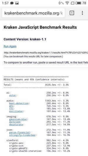 Что касается бенчмарков для оценки скорости движка javascript, то стоит всегда делать скидку на то, что в них результаты существенно зависят от браузера, в котором запускаются, так что сравнение может быть истинно корректным только на одинаковых ОС и браузерах, а такая возможность имеется при тестировании не всегда. В случае с ОС Android мы всегда стараемся использовать Google Chrome.