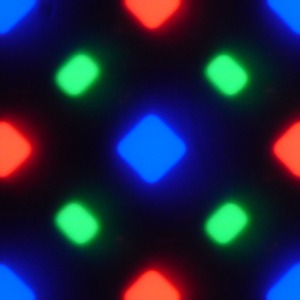В этом экране используется матрица AMOLED — активная матрица на органических светодиодах. Полноцветное изображение создается с помощью субпикселей трех цветов — красного (R), зеленого (G) и синего (B), но зеленых субпикселей в два раза больше, что можно обозначить как RGBG. Это подтверждается фрагментом микрофотографии: