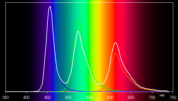 Без коррекции (профиль По умолчанию) спектры компонент (то есть спектры чистых красного, зеленого и синего цветов) очень хорошо разделены: