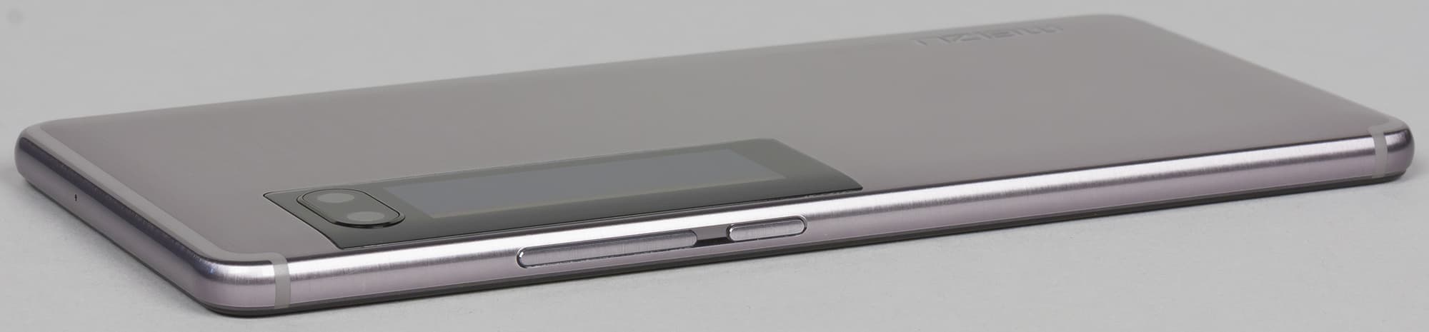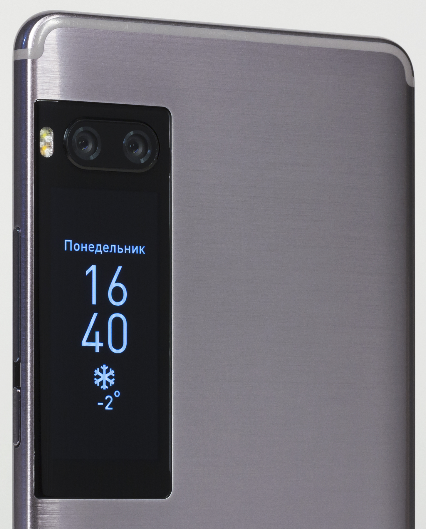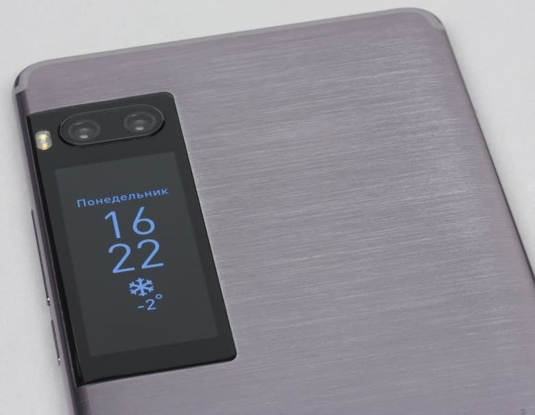 Но еще более необычно выглядит задняя часть корпуса: здесь в цельнометаллическое корытце врезан миниатюрный второй дисплей, прикрытый сверху защитным стеклом. Дисплей, кстати, тоже сенсорный (как и основной) и реагирует на жесты.