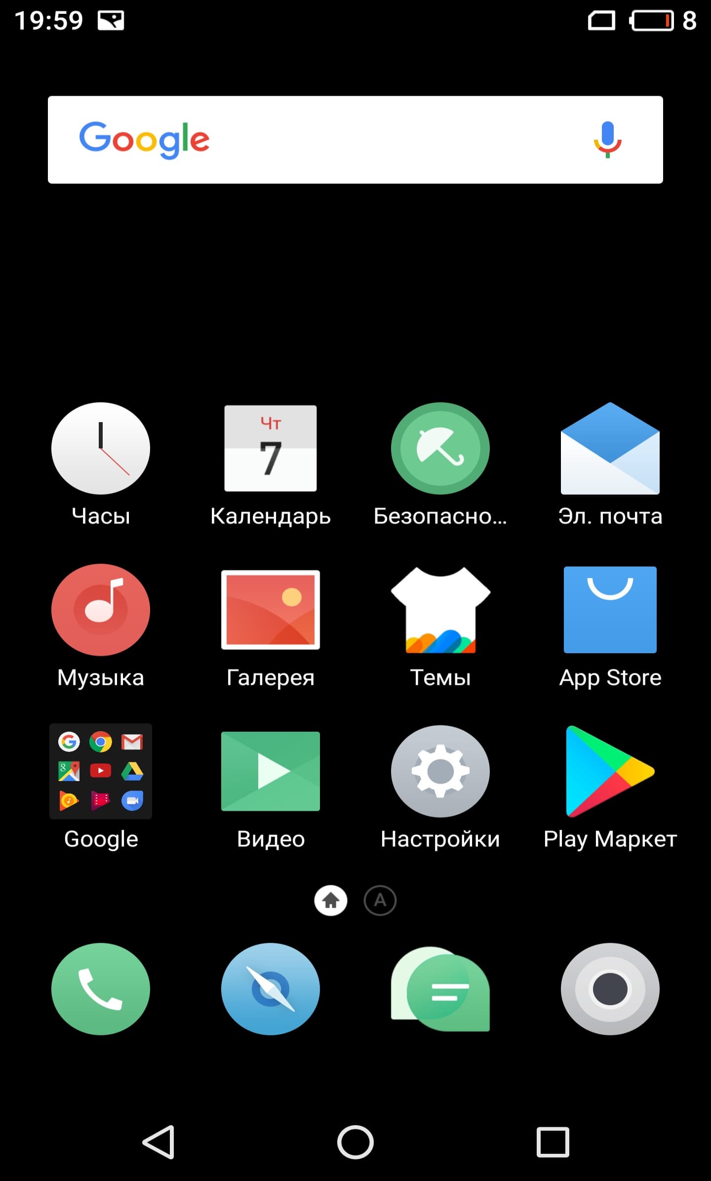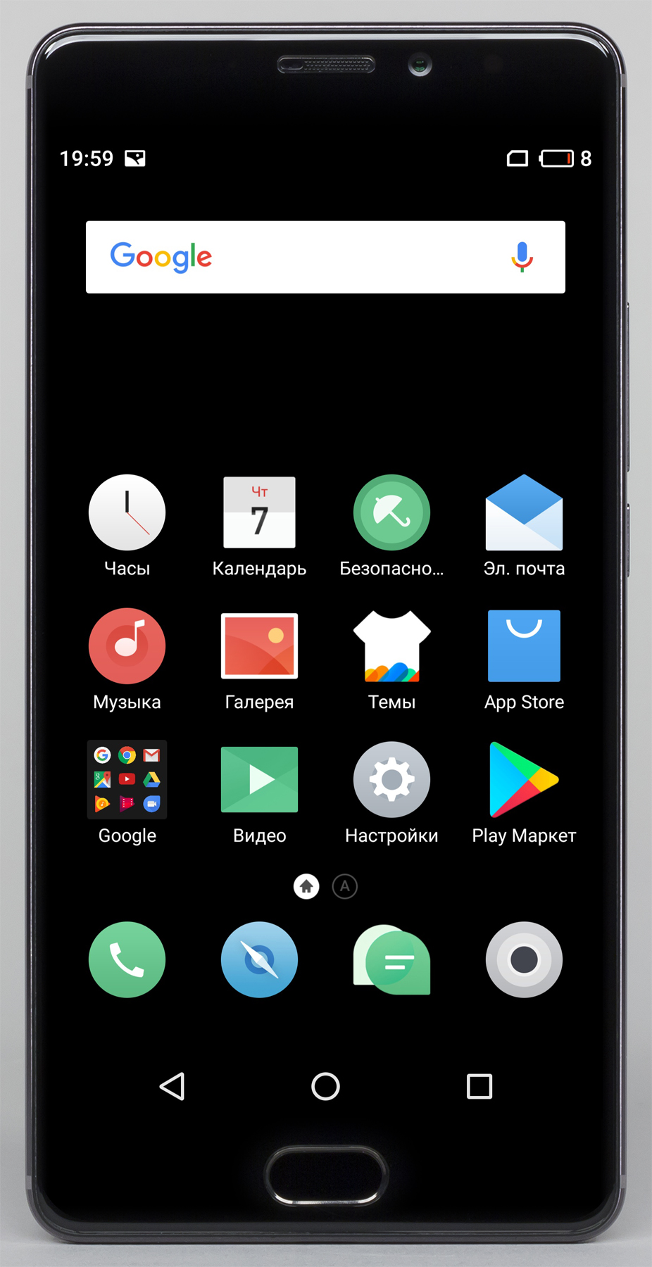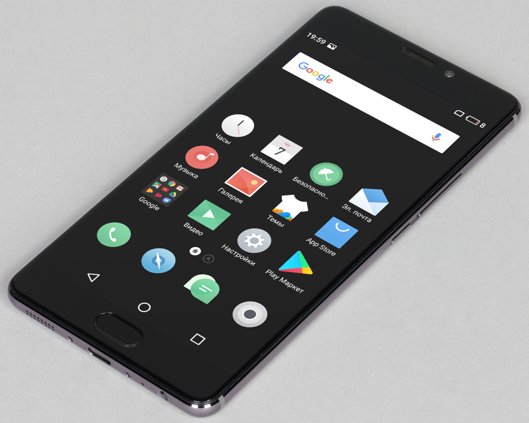 Внизу под экраном стандартно для Meizu установлена лишь одна кнопка, причем нажимаемая. В нее врезана площадка сканера отпечатков пальцев mTouch (360 градусов сканирования, считывание за 0,15 с). Если же вам неудобно пользоваться схемой управления Meizu, подразумевающей выполнение разных функций по одиночному, двойному и длительному нажатию на центральную клавишу, всегда можно прибегнуть к помощи экранной панели кнопок.