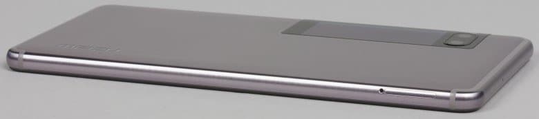 На противоположной грани (почему-то с самого краю, а не по продольной оси; смотрится это некрасиво) врезан разъем для установки карточек. Разъем сдвоенный, может принять пару SIM-карт формата Nano-SIM, но не рассчитан на карты памяти microSD.
