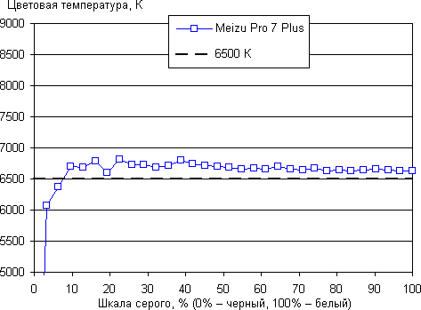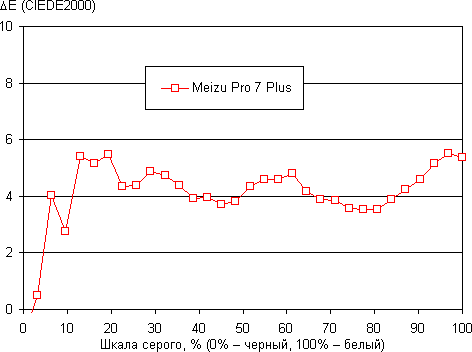 Цвета излишне насыщенные, а цветовой баланс у экранов явно различается. Напомним, что фотография не может служить надежным источником сведений о качестве цветопередачи и приводится только для условной наглядной иллюстрации. В частности, выраженный красноватый оттенок белого и серого полей, присутствующий на фотографиях экрана Meizu Pro 7 Plus, при перпендикулярном взгляде визуально отсутствует, что подтверждается аппаратными тестами с помощью спектрофотометра. Причина в том, что спектральная чувствительность матрицы фотоаппарата неточно совпадает с этой характеристикой человеческого зрения.