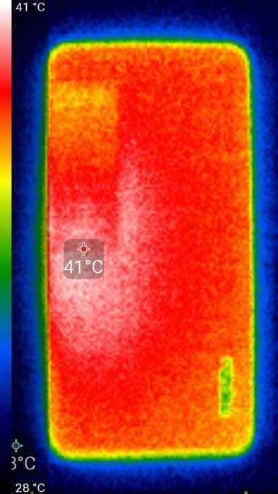 Нагрев выше по центру и ближе к правому краю, что, видимо, соответствует расположению микросхемы SoC, но в целом сильно нагрета вся задняя поверхность смартфона. По данным теплокамеры, максимальный нагрев составил 41 градус (при температуре окружающего воздуха в 24 градуса), это средний нагрев в данном тесте для современных смартфонов.