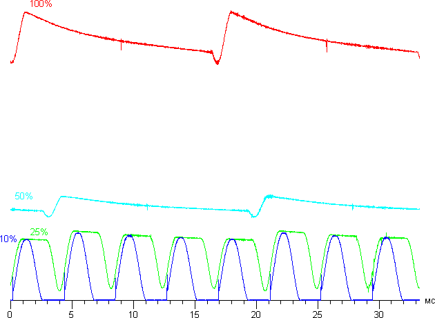 Видно, что на максимальной и средней яркости амплитуда модуляции не очень большая, в итоге видимого мерцания нет. Однако при сильном понижении яркости появляется модуляция с большой относительной амплитудой, ее наличие уже можно увидеть в тесте на присутствие стробоскопического эффекта или просто при быстром движении глаз. В зависимости от индивидуальной чувствительности такое мерцание может вызывать повышенную утомляемость.