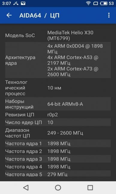- SoC MediaTek Helio X30, 10 ядер Cortex-A35/Cortex-A53/Cortex-A73 @1,9/2,2/2,6 ГГц