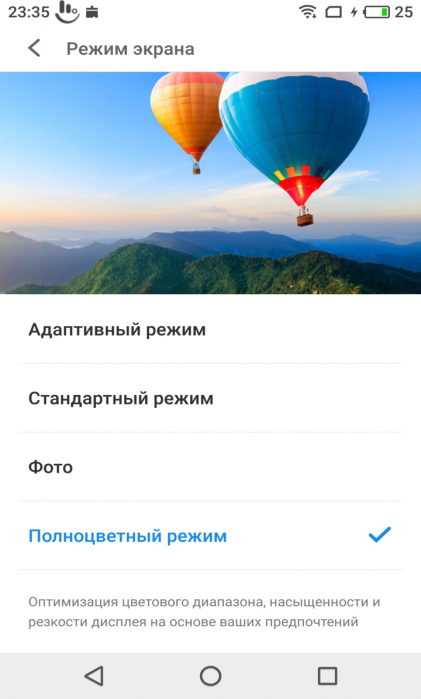 Фотография выше получена после выбора профиля Адаптивный в настройках экрана — видимо, этот профиль выбран по умолчанию. Всего профилей четыре: