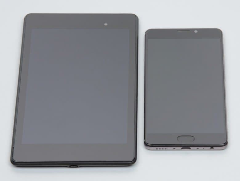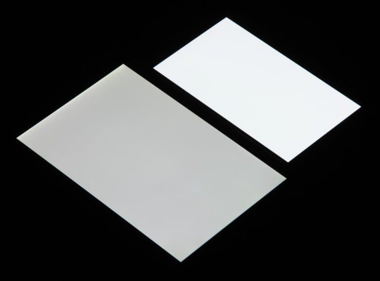 Лицевая поверхность экрана выполнена в виде стеклянной пластины с зеркально-гладкой поверхностью, устойчивой к появлению царапин. Судя по отражению объектов, антибликовые свойства экрана не хуже, чем у экрана Google Nexus 7 (2013) (далее просто Nexus 7). Для наглядности приведем фотографию, на которой в выключенных экранах отражается белая поверхность (слева — Nexus 7, справа — Meizu Pro 7 Plus, далее их можно различать по размеру):
