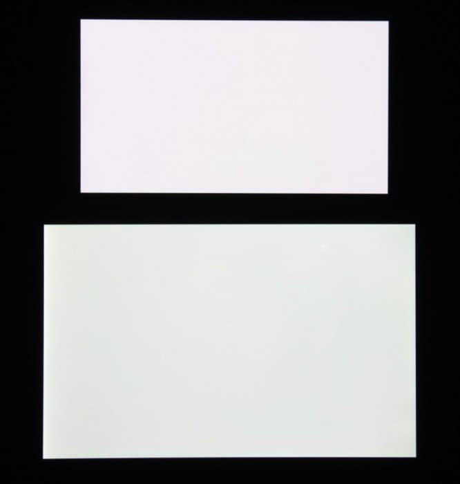 Вернемся к основному экрану. Он характеризуется великолепными углами обзора. Правда, белый цвет при отклонении даже на небольшие углы поочередно приобретает легкий сине-зеленый и розоватый оттенок, но черный цвет остается просто черным под любыми углами. Он настолько черный, что параметр контрастности в данном случае неприменим. Для сравнения приведем фотографии, на которых на экраны Meizu Pro 7 Plus (профиль Адаптивный) и второго участника сравнения выведены одинаковые изображения, при этом яркость экранов изначально установлена примерно на 200 кд/м², а цветовой баланс на фотоаппарате принудительно переключен на 6500 К.