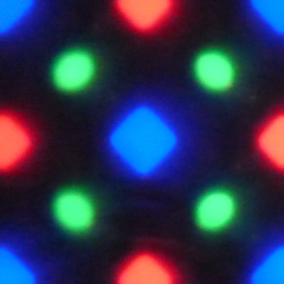 В этом экране используется матрица Super AMOLED — активная матрица на органических светодиодах. Полноцветное изображение создается с помощью субпикселей трех цветов — красного (R), зеленого (G) и синего (B), но красных и синих субпикселей в два раза меньше , что можно обозначить как RGBG. Это подтверждается фрагментом микрофотографии: