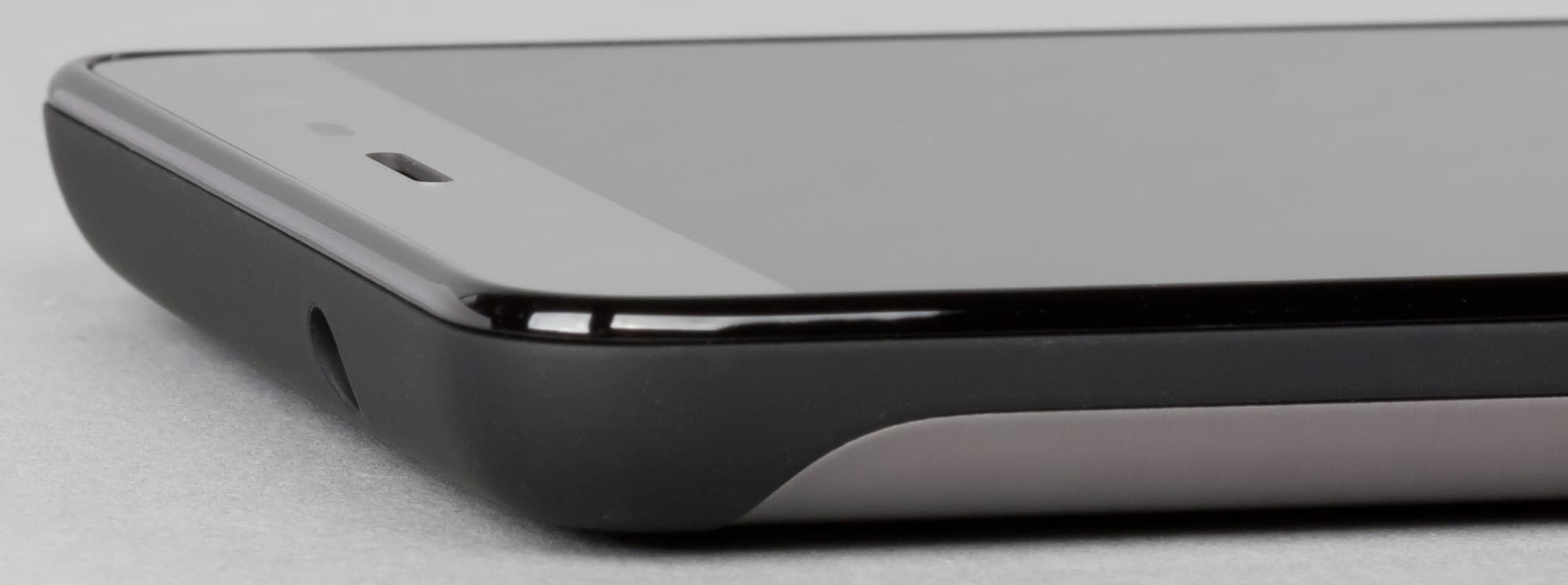 Передняя панель прикрыта плоским стеклом без покатых краев. Бортика вокруг экрана как такового нет, но пластиковая твердая прокладка настолько толстая, что она немного выпирает над стеклом, создает некое подобие микробортика. Она слишком уж хорошо заметна на ощупь, слегка даже впивается в ладонь, это создает определенный диссонанс между сильно покатой задней стенкой и резкими, выпирающими гранями спереди.