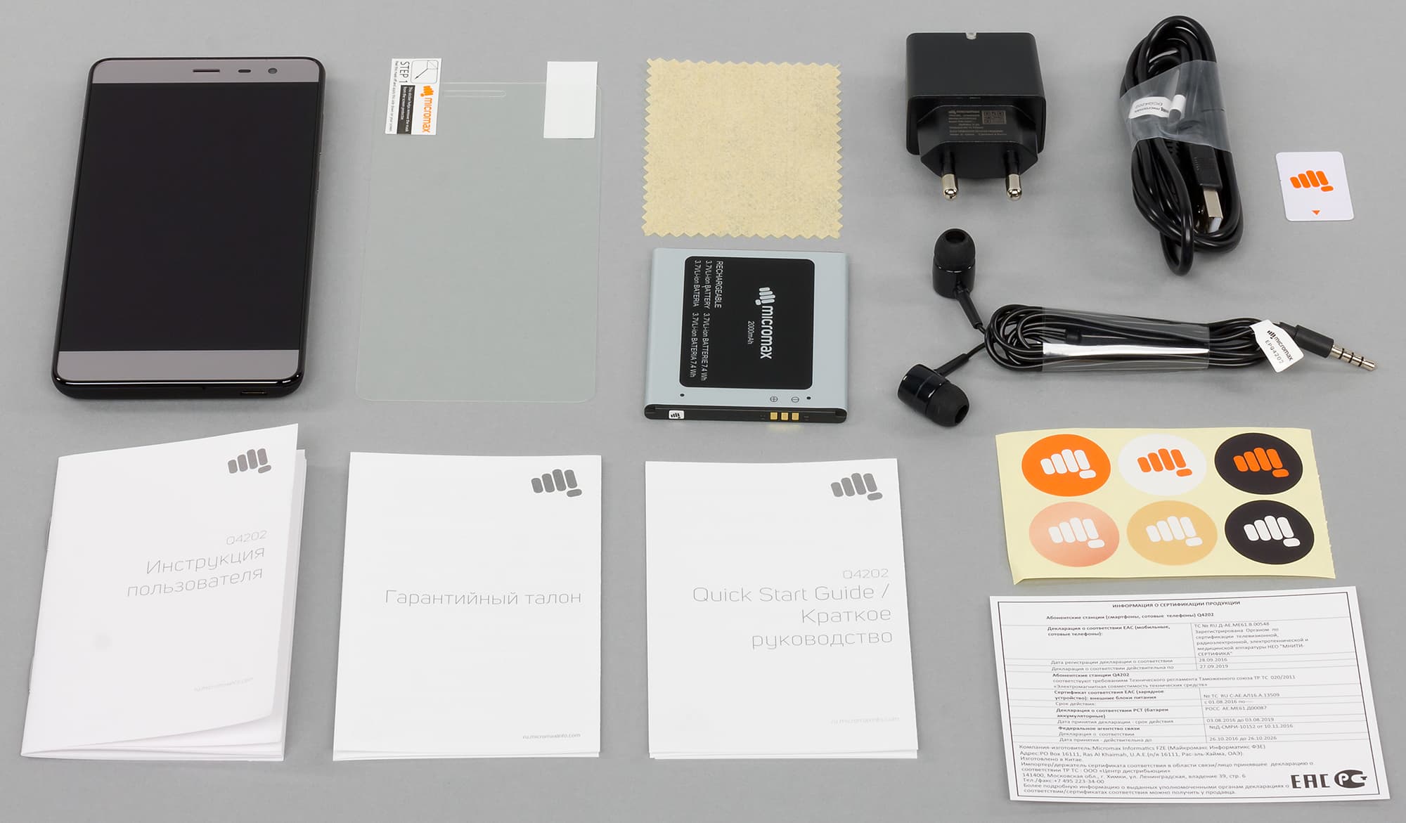 Комплект состоит из соединительного кабеля, маломощного сетевого адаптера с максимальным выходным током всего 0,7 А (при напряжении 5 В), проводной гарнитуры с резиновыми накладками внутриканального типа, защитной пленки на экран и бумажной инструкции на русском языке.