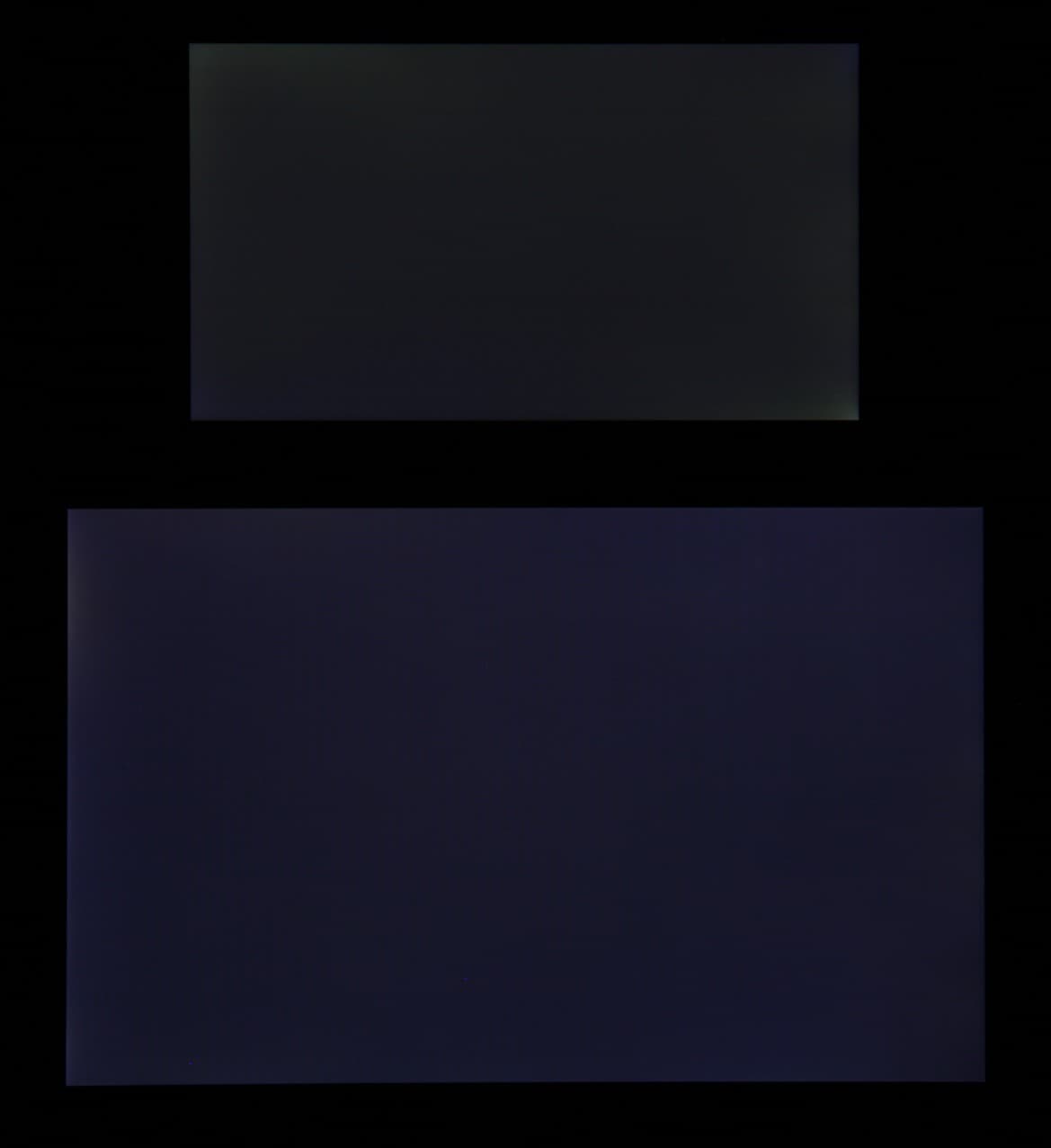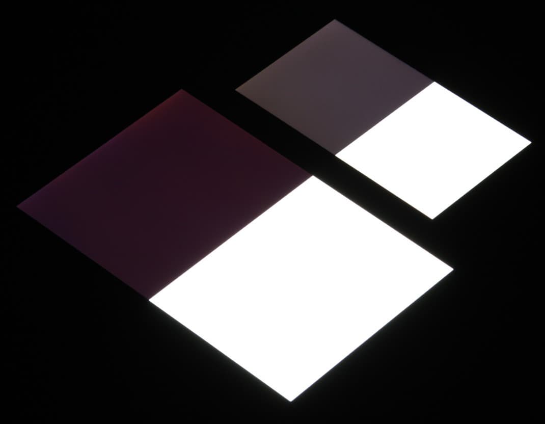 Яркость под углом у экранов уменьшилась (как минимум в 5 раз, исходя из разницы в выдержке), но у Micromax Bolt Warrior 2 экран заметно темнее. Черное поле при отклонении по диагонали высветляется сильно и приобретает красноватый или красно-фиолетовый оттенок. Фотографии ниже это демонстрируют (яркость белых участков в перпендикулярном плоскости экранов направлении одинаковая!):