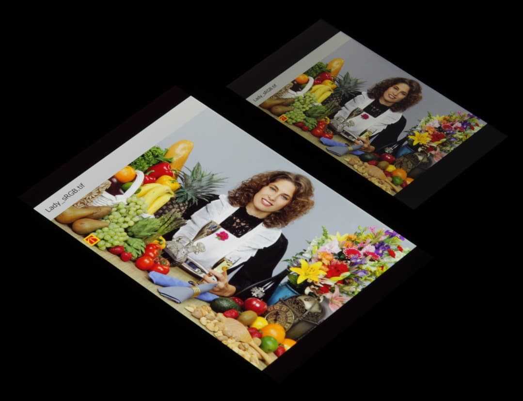 В итоге цвета имеют естественную насыщенность. Баланс оттенков на шкале серого хороший, так как цветовая температура несильно выше стандартных 6500 К, и отклонение от спектра абсолютно черного тела (ΔE) меньше 10, что для потребительского устройства считается приемлемым показателем. При этом цветовая температура и ΔE мало изменяются от оттенка к оттенку — это положительно сказывается на визуальной оценке цветового баланса. (Самые темные области шкалы серого можно не учитывать, так как там баланс цветов не имеет большого значения, да и погрешность измерений цветовых характеристик на низкой яркости большая.)