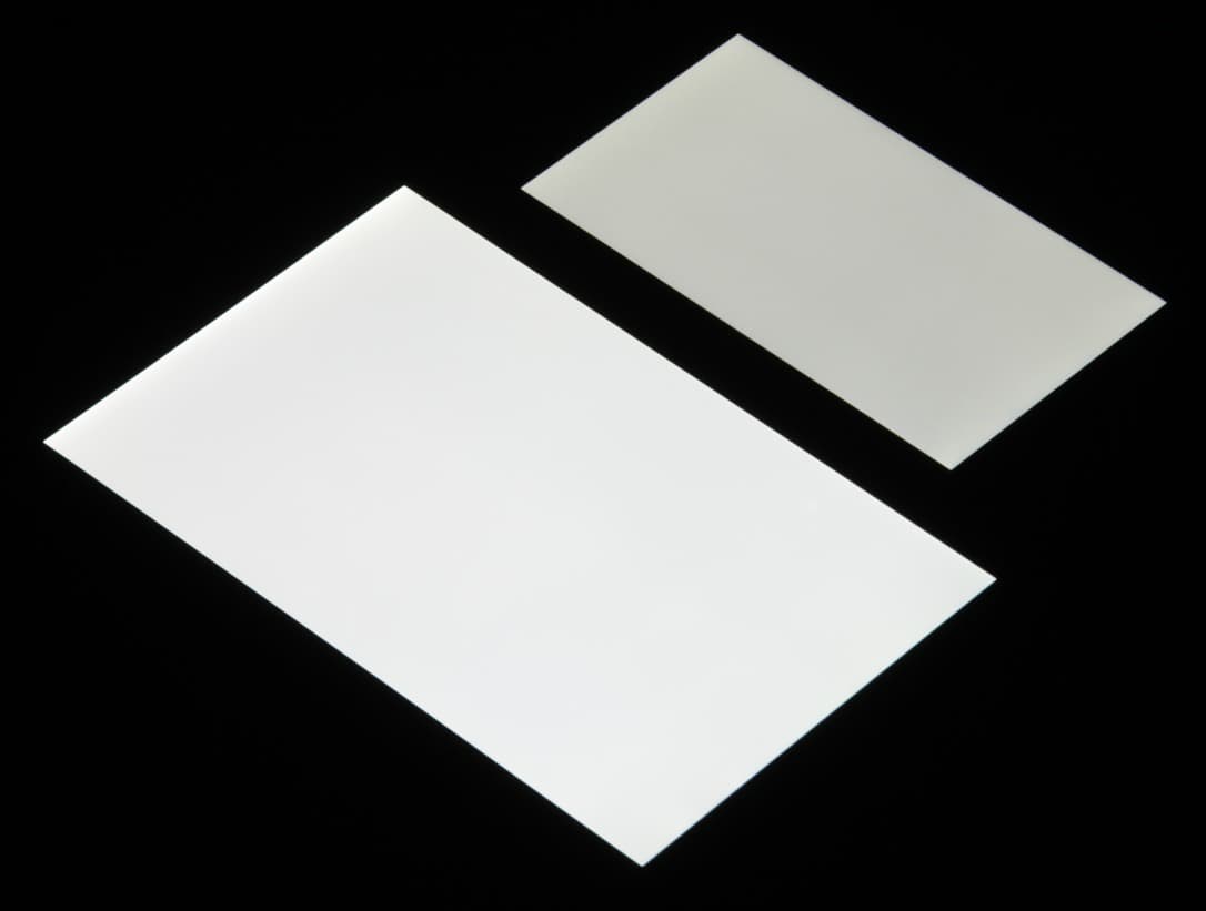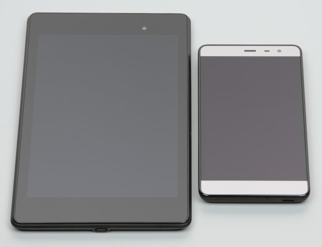 Лицевая поверхность экрана выполнена в виде стеклянной пластины с зеркально-гладкой поверхностью, устойчивой к появлению царапин. Судя по отражению объектов, антибликовые свойства экрана лучше, чем у экрана Google Nexus 7 (2013) (ниже просто Nexus 7). Для наглядности приведем фотографию, на которой в выключенных экранах отражается белая поверхность (слева — Nexus 7, справа — Micromax Bolt Warrior 2, далее их можно различать по размеру):