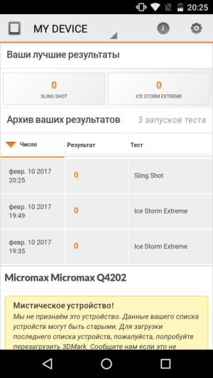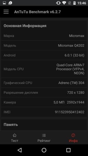 Qualcomm Snapdragon 210 — SoC совсем простенькая, приблизительно на уровне MediaTek MT6737 или даже еще чуть ниже. Соответственно, во всех тестах результаты невысоки: в комплексном AnTuTu платформа набирает не более 20К очков, а что касается графических тестов, то видеоускорителем не поддерживается OpenGL ES 3.1, а с тестами 3DMark смартфон вообще не справился.