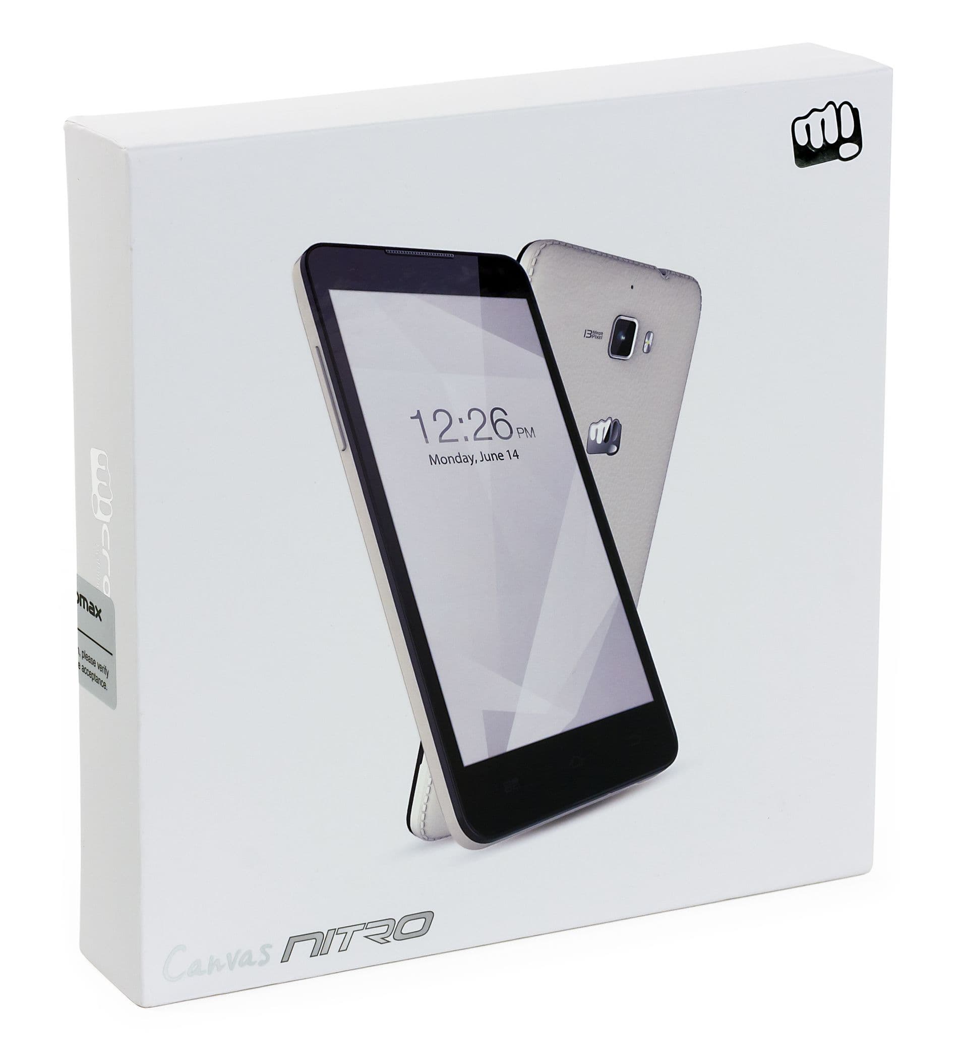 Micromax Canvas Nitro поставляется в продажу в плоской квадратной коробке, выполненной из твердного белого картона. Упаковка оформлена достаточно аккуратно и стильно, разноцветия нет, минимум надписей. Внутри имеется несколько отдельных коробочек размером поменьше, все аксессуары упакованы в собственные отделения, в целом, упаковка смартфона оставляет положительное впечатление и настраивает на благоприятное знакомство с содержимым.