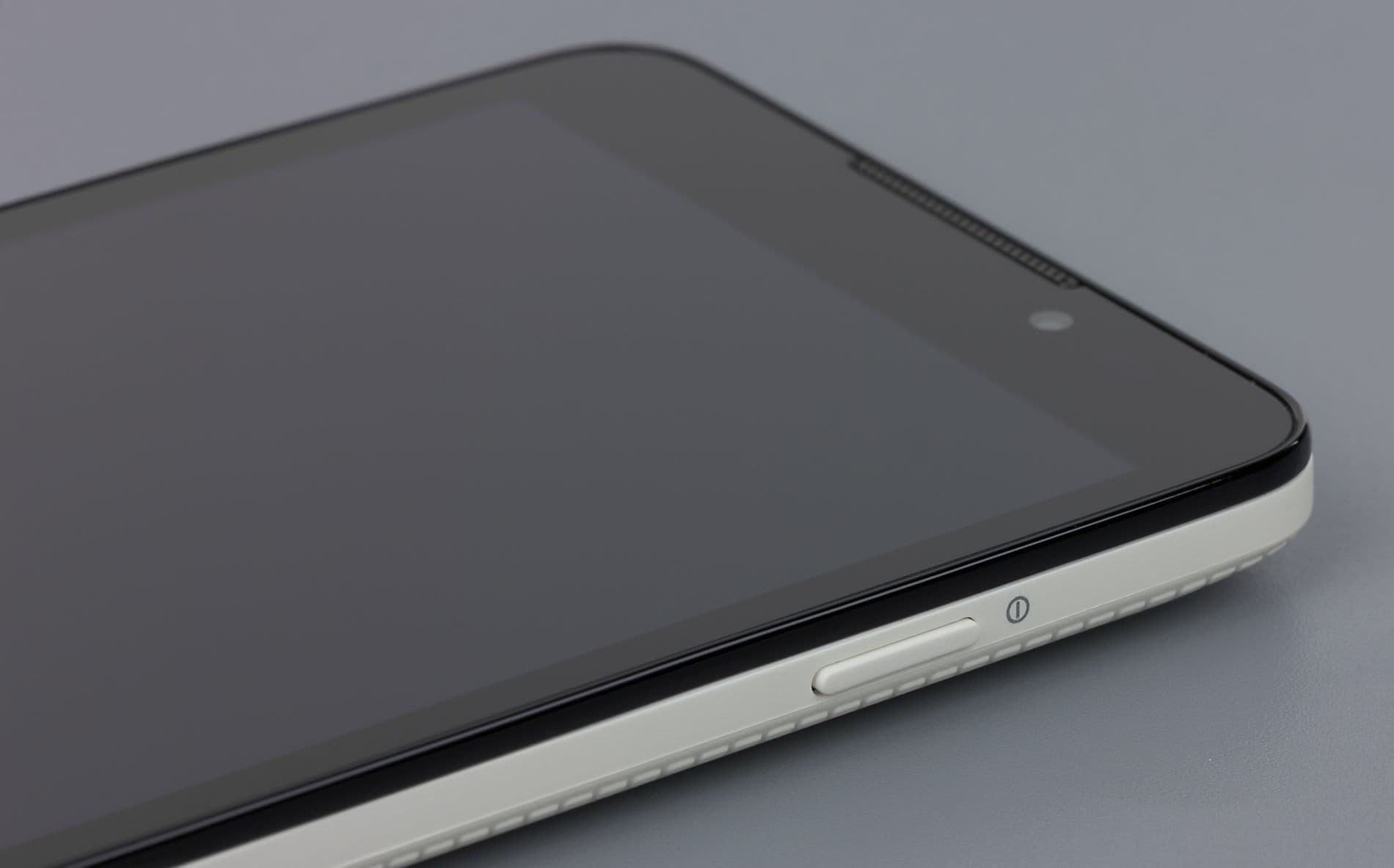 Лицевая поверхность экрана выполнена в виде стеклянной пластины с зеркально-гладкой поверхностью, устойчивой к появлению царапин. Судя по отражению объектов антибликовые свойства экрана не хуже, чем у экрана Google Nexus 7 (2013) (далее просто Nexus 7). Для наглядности приведем фотографию, на которой в выключенных экранах отражается белая поверхность (слева — Nexus 7, справа — Micromax Canvas Nitro, далее их можно различать по размеру):