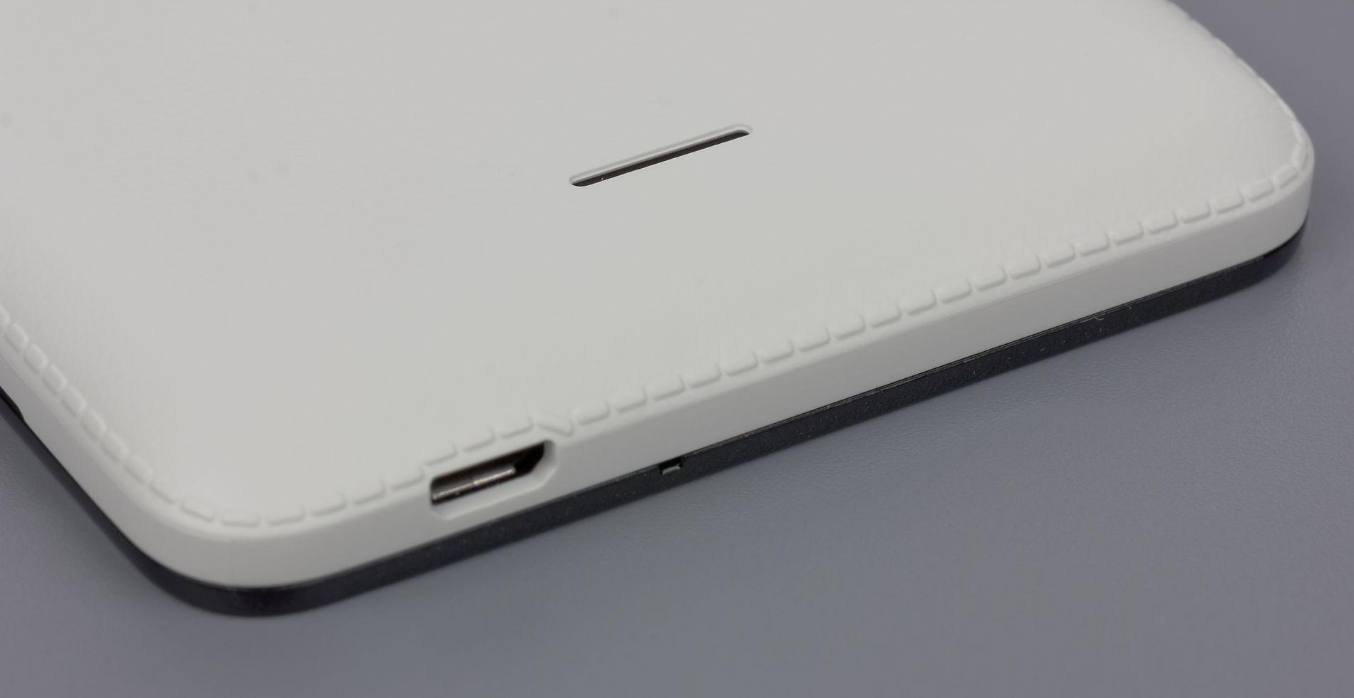Универсальный разъем Micro-USB размещен в нижнем торце, аудиовыход для наушников 3,5 мм — врезан в верхний. Разъем Micro-USB здесь не поддерживает режим подключения внешних устойств (USB OTG). Никаких заглушек на своих разъемах смартфон не имеет, так как не оборудован защитой от воды и грязи. Не найти здесь и крепления для ремешка.