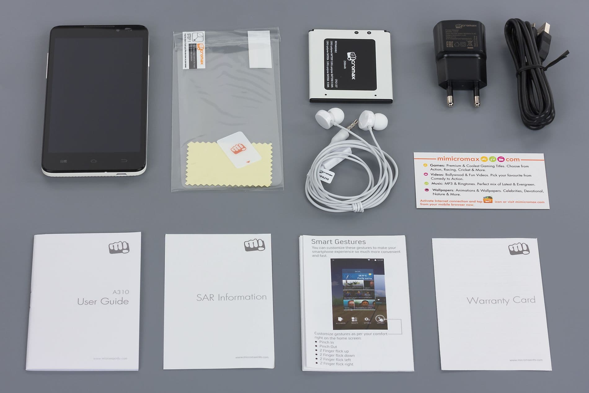Комплект аксессуаров состоит из компактного зарядного устройства (5 В, 1 А) со встроенным светодиодом, соединительного кабеля Micro-USB, симпатичной проводной стереогарнитуры с тонким проводом круглого сечения и резиновыми амбушюрами внутриканального типа, а также защитной пленки на экран и нескольких книжиц бумажной документации.