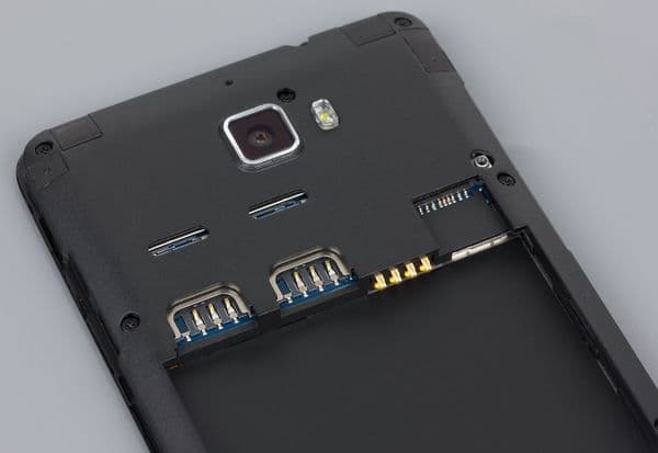 Задняя пластиковая крышка традиционно крепится на нескольких защелках и достаточно легко снимается с корпуса — для этого сбоку имеется небольшой уступ для ногтя. Под крышкой можно обнаружить стандартный комплект слотов: два — для Micro-SIM, а третий — для карты памяти microSD. Батарея здесь съемная, она подпирает собой все слоты с карточками, так что горячая замена их невозможна.