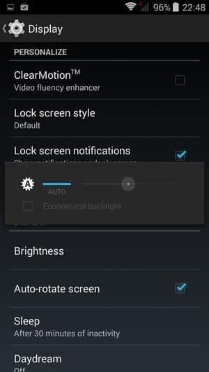 Ширина боковых рамок от края экрана до края корпуса составляет около 4,5 мм — рамки достаточно широкие. Толщина верхней кромки над экраном составляет 13 мм, нижней — 18 мм. Яркость дисплея можно подстраивать вручную, а можно задействовать автоматическую регулировку, основанную на работе датчика освещения. В настройках можно также задействовать режим экономичной подсветки экрана. Технология мультитач здесь позволяет обрабатывать до 5 одновременных прикосновений. Имеется у смартфона и датчик приближения, который блокирует экран при поднесении смартфона к уху. По поводу возможности управлять экраном в перчатках ничего не сказано в настройках.