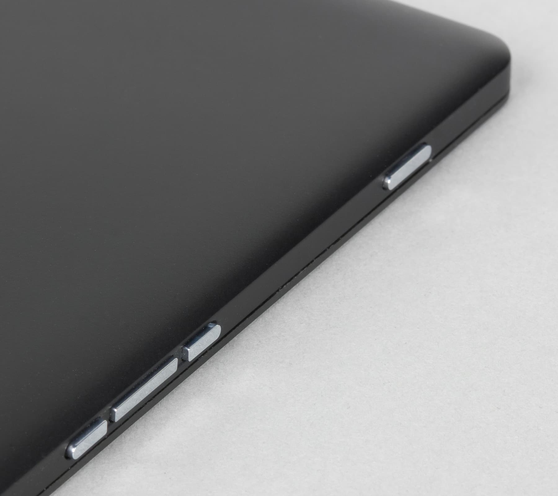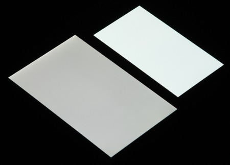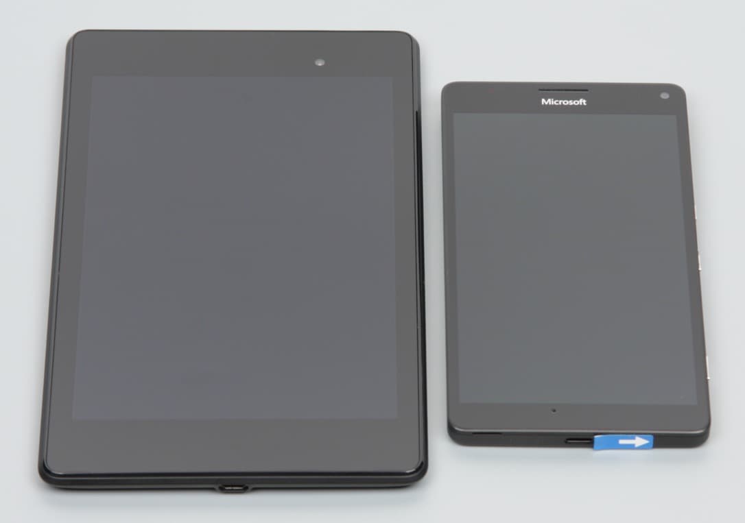 Лицевая поверхность экрана выполнена в виде стеклянной пластины с зеркально-гладкой поверхностью, устойчивой к появлению царапин. Судя по отражению объектов антибликовые свойства экрана не хуже, чем у экрана Google Nexus 7 (2013) (далее просто Nexus 7). Для наглядности приведем фотографию, на которой в выключенных экранах отражается белая поверхность (слева — Nexus 7, справа — Microsoft Lumia 950 XL, далее их можно различать по размеру):