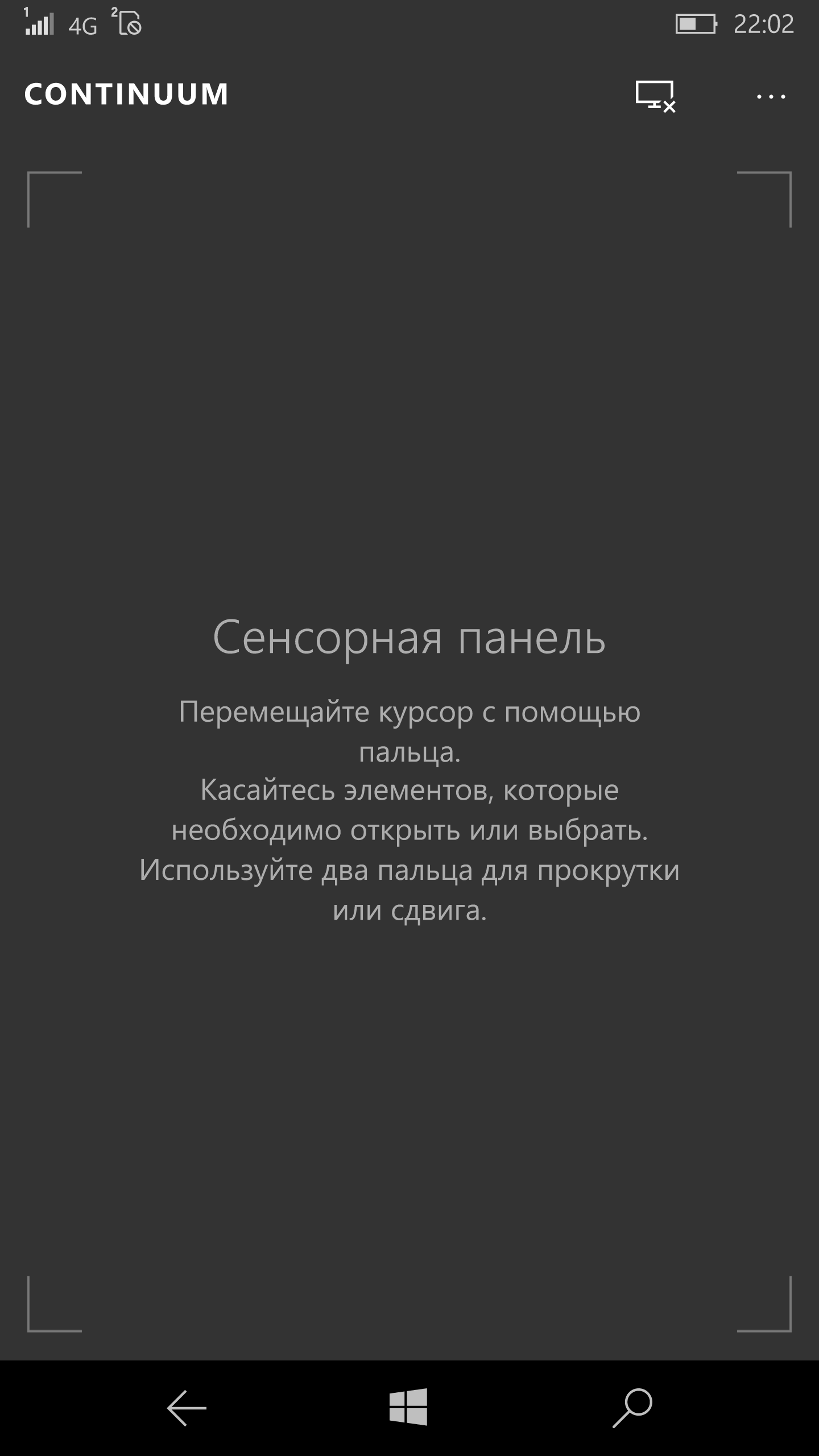 Внешний вид интерфейса на большом мониторе похож на настольную версию Windows 10. В верхней части окна идет плавающее наложение статусной строки смартфона (в ней дополнительно появляется индикатор текущего языка текстового ввода). Внизу окна находится кнопка вызова меню приложений, кнопка возврата, значок поиска, кнопка для вызова списка открытых приложений, значки работающих программ и в самом правом углу — иконка вызова панели уведомлений.