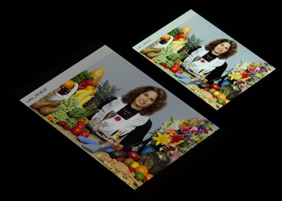 Яркость под углом у обоих экранов заметно уменьшилась (чтобы избежать сильного затемнения, выдержка увеличена в сравнении с предыдущими двумя фотографиями), но в случае Microsoft Lumia 950 XL падение яркости выражено гораздо меньше. В итоге при формально одинаковой яркости экран Microsoft Lumia 950 XL визуально выглядит гораздо более ярким (в сравнении с ЖК-экранами), так как на экран мобильного устройства часто приходится смотреть как минимум под небольшим углом. И тестовая картинка:
