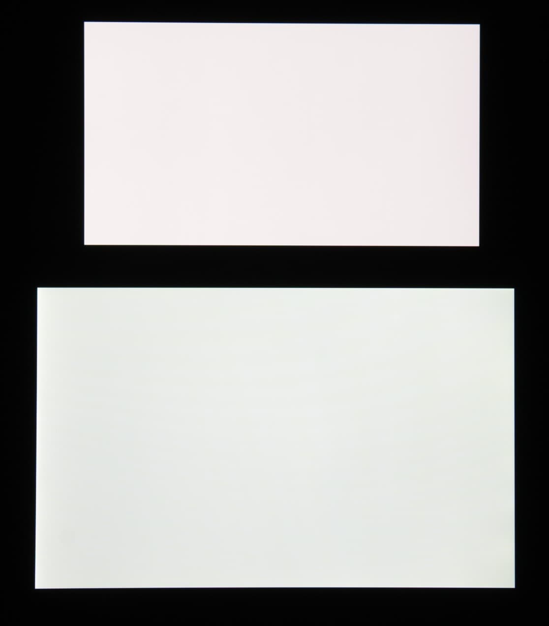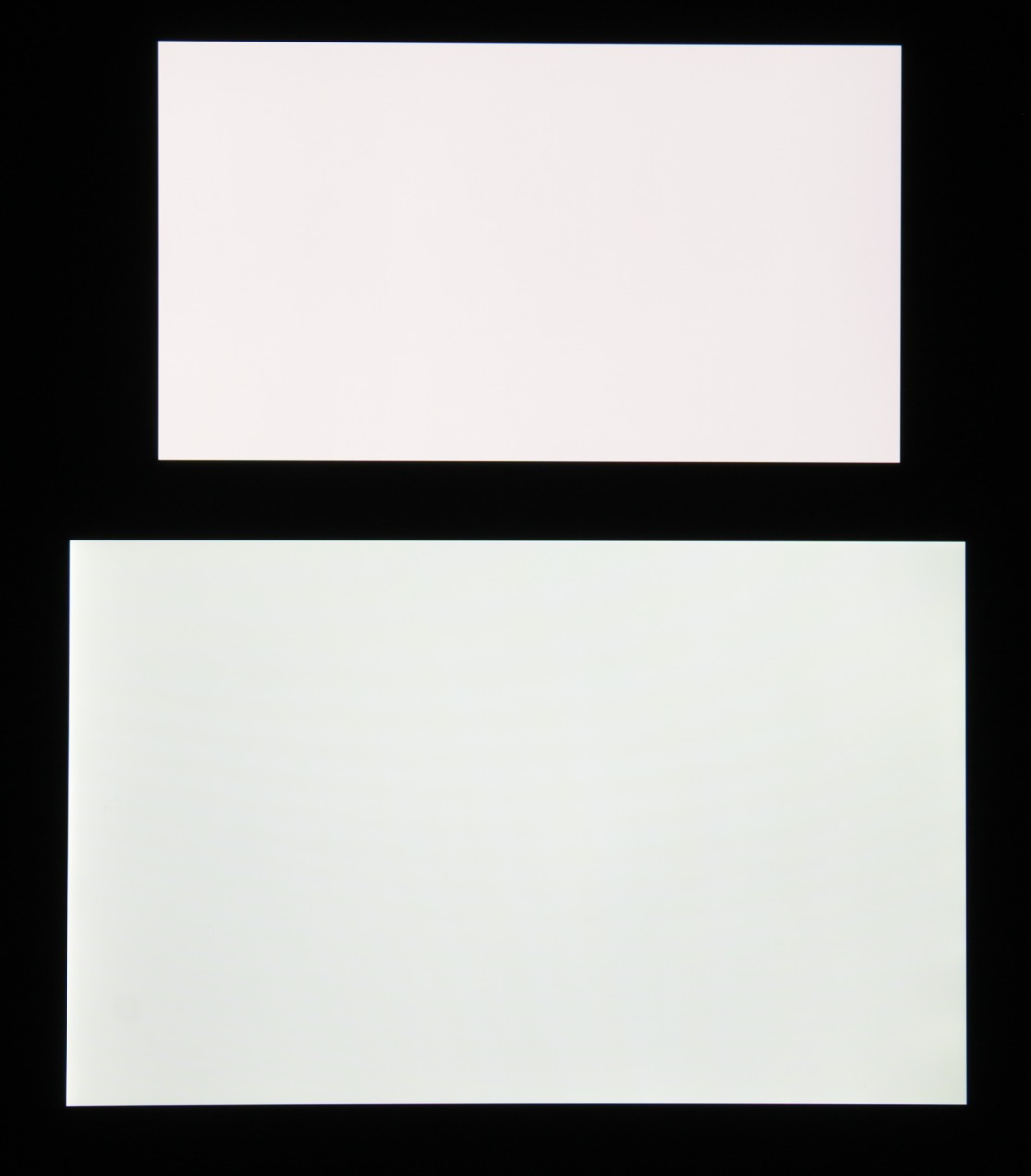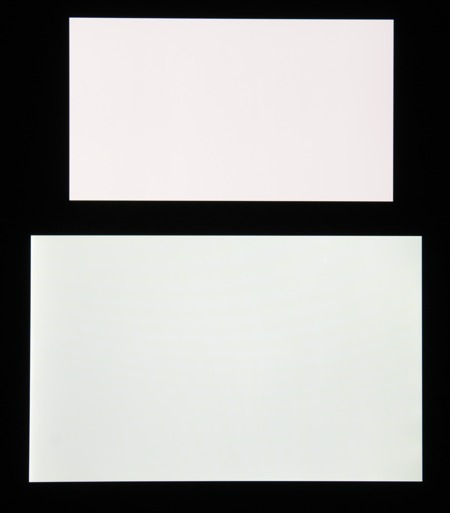 Экран характеризуется великолепными углами обзора, правда белый цвет при отклонении даже на небольшие углы приобретает легкий сине-зеленый или розоватый оттенок, но черный цвет — просто черный под любыми углами. Настолько черный, что параметр контрастности в данном случае просто неприменим. Для сравнения приведем фотографии, на которых на экраны Microsoft Lumia 950 XL (профиль Стандартный) и второго участника сравнения выведены одинаковые изображения, при этом яркость экранов изначально установлена примерно на 200 кд/м², а цветовой баланс на фотоаппарате принудительно переключен на 6500 К. Белое поле: