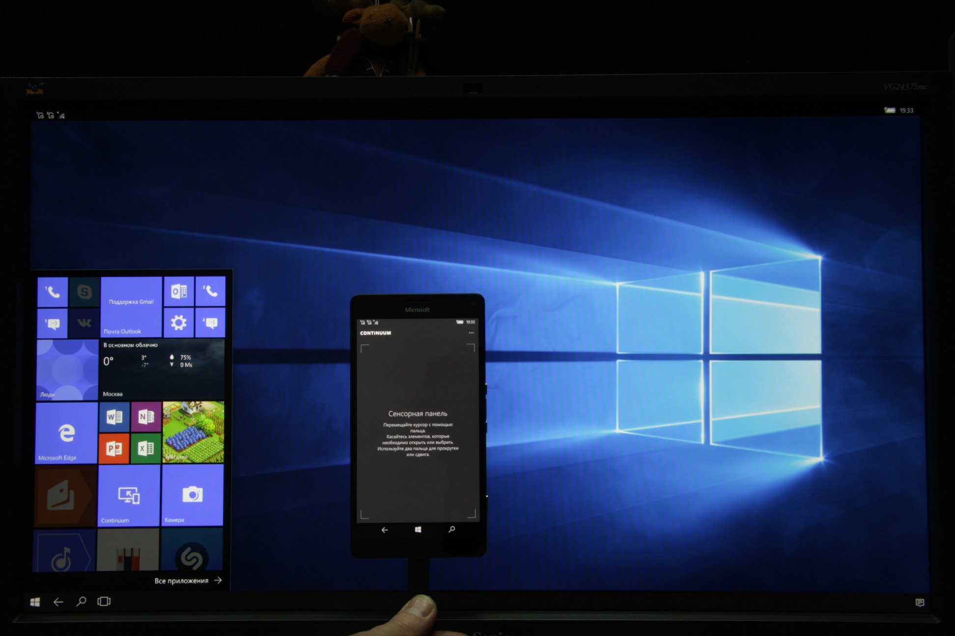 Для вывода на внешний экран предлагается использовать описанный далее кубик-адаптер с разъемами USB Type-C для подключения смартфона и блока питания, а также с разъемами USB для подключения периферии и разъемами HDMI и DisplayPort для подключения внешних устройств отображения. Мы опробовали подключение по DisplayPort к монитору с разрешением 1920 на 1080 пикселей. Для вывода на монитор нужно запустить специальное приложение Continuum. При этом экран самого смартфона превращается в сенсорную панель, а на монитор выводится рабочий стол с окном в уголке, имитирующем исходный рабочий стол на экране смартфона, видимо, чтобы переход на большой экран был не таким резким.