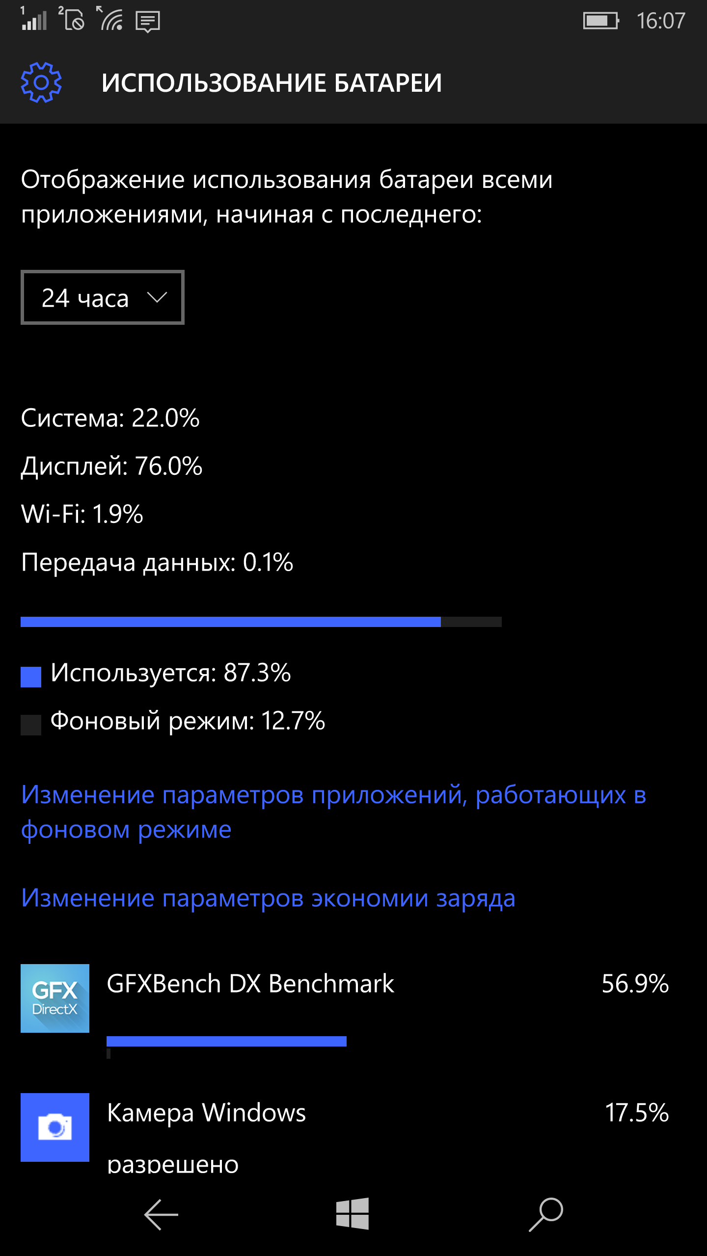 Единственный сценарий, который остался доступным — просмотр видео по Wi-Fi. При установке яркости полного экрана на уровне 100 кд/м², смартфон смог обеспечить около десяти часов работы в данном режиме. Этот результат находится на уровне других ранее протестированных моделей, однако нужно учесть, что в Lumia 950 XL существенно крупнее экран, а также он имеет более высокое разрешение. Несколько информационных утилит из магазина приложений оценивали время ожидания на уровне трех дней, что субъективно вполне соответствует реальности. Так что с точки зрения реализации спящего режима замечаний к устройству нет.