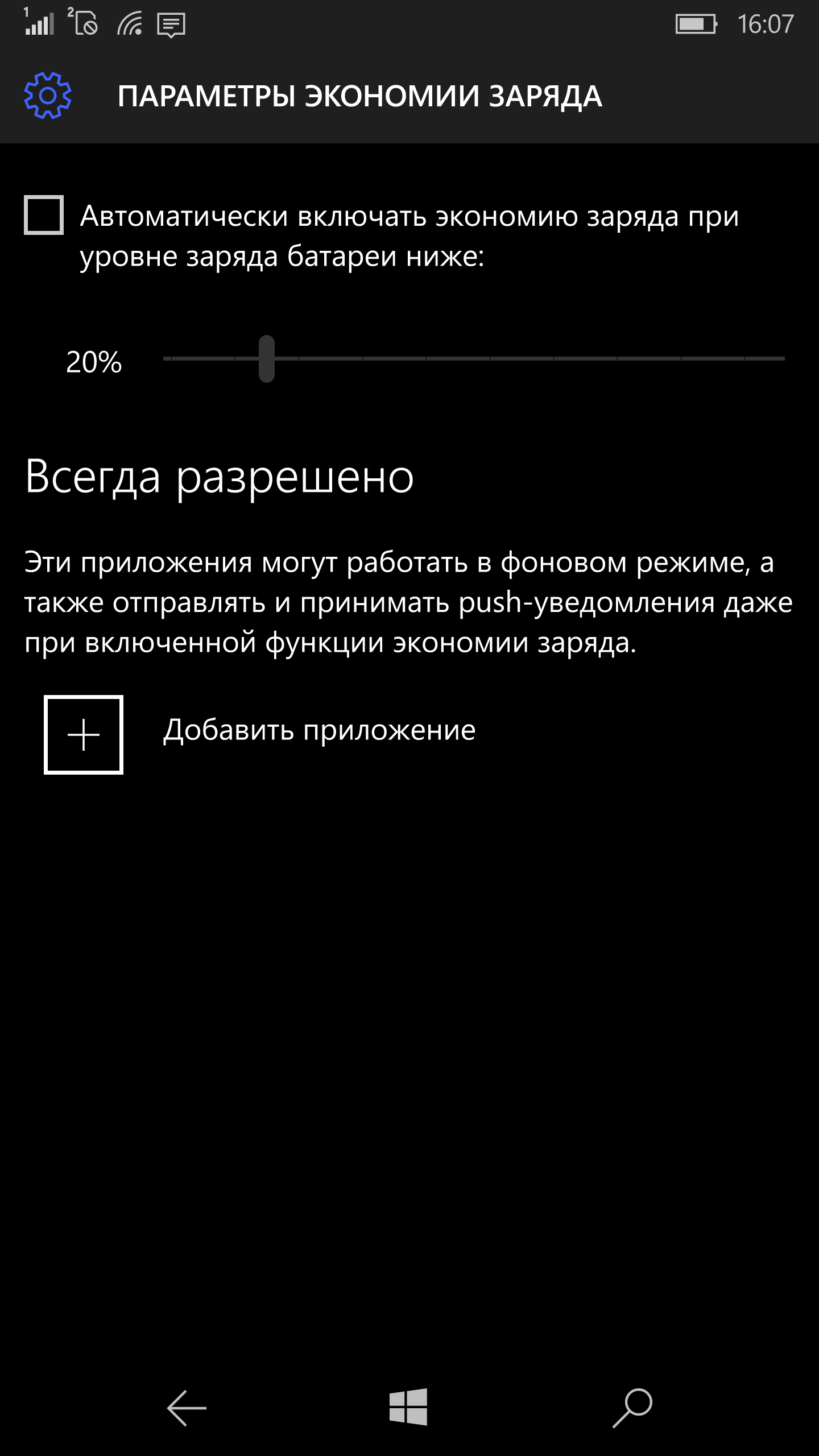 Встроенные средства контроля за батареей позволяют проверить распределение потребления по приложениям, а также настроить экономный режим. В нем блокируется синхронизация, фоновая работа и push-уведомления приложений, кроме включенных в специальный список. Этот режим может активироваться автоматически при снижении уровня заряда батареи ниже указанного в опциях.