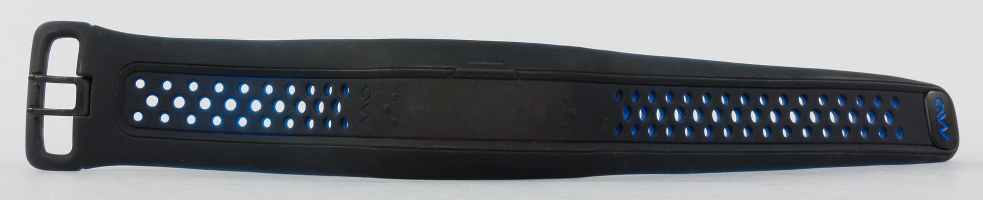 Отметим, что силиконовый ремешок очень гибкий, мягкий. Это хорошо видно по представленной фотографии. Однако, он несъемный. Ремешок плавно переходит в основную часть устройства. Ее внешняя поверхность представляет собой несенсорный экран из ряда светодиодов, а вокруг экрана — три сенсорные кнопки. На фотографии ниже можно увидеть три точки-бугорка слева, около выдавленной надписи Mio, и симметрично расположенные три точки справа. Это и есть две сенсорные зоны, отвечающие за листание влево-вправо. При нажатии на любую из них экран загорится и покажет текущее время, цель по активности, а также дневные результаты: дистанцию, количество шагов и количество калорий. Для того, чтобы переходить от одного параметра к другому, нужно листать кнопки. Впрочем, на наш взгляд, одной кнопки вполне бы хватило. Данных не так много, чтобы надо было обязательно иметь возможность листать в обе стороны.