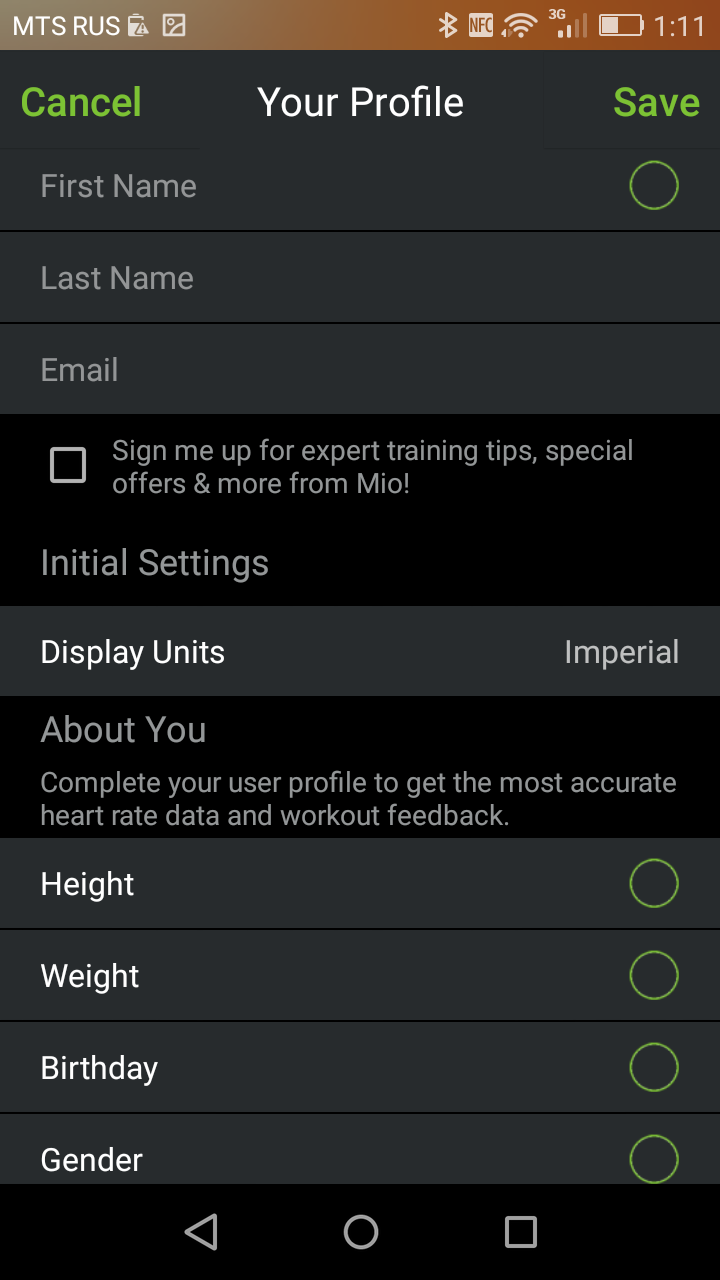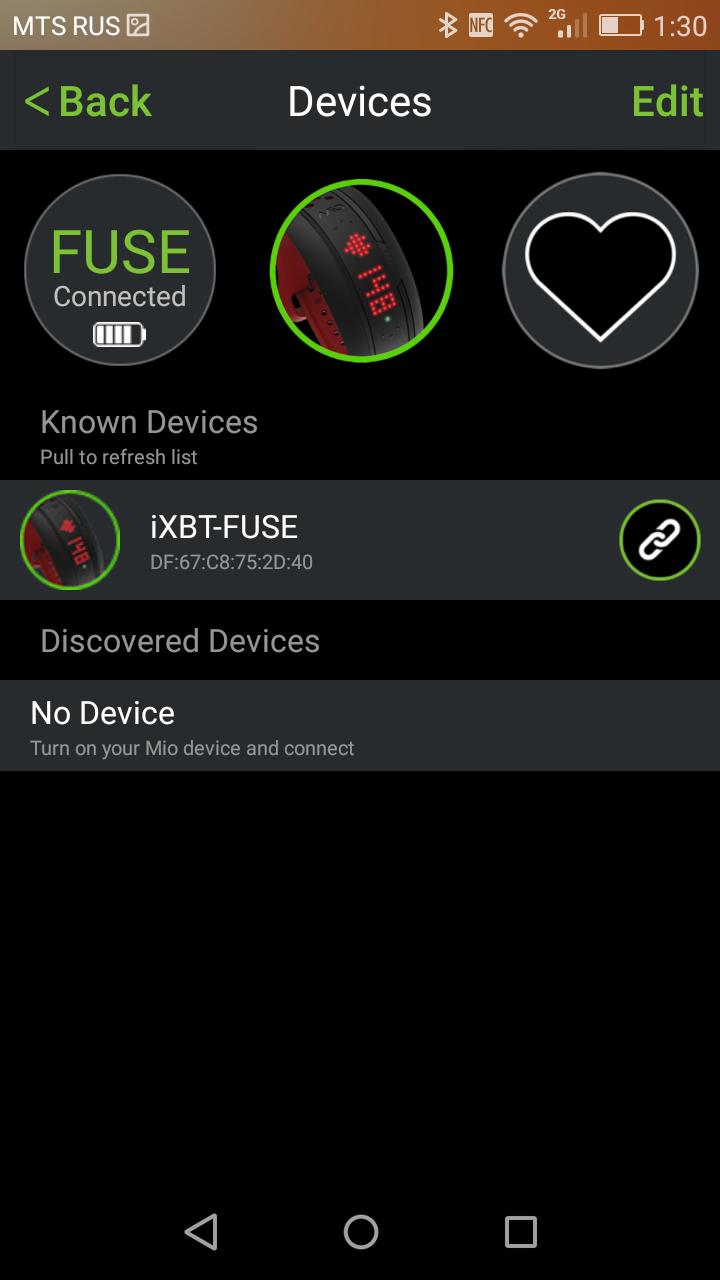 При первом запуске приложения вас просят зарегистрироваться. Опции регистрации через соцсети нет. Вам необходимо сообщить такие параметры, как вес, рост, возраст и пол. Далее надо подсоединить Fuse Mio к смартфону. Для этого нажимаем Connect Mio Device и видим в списке устройств наш браслет (здесь можно присвоить ему имя). Нажимаем на значок соединения.