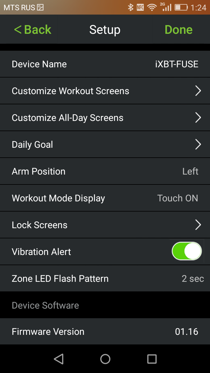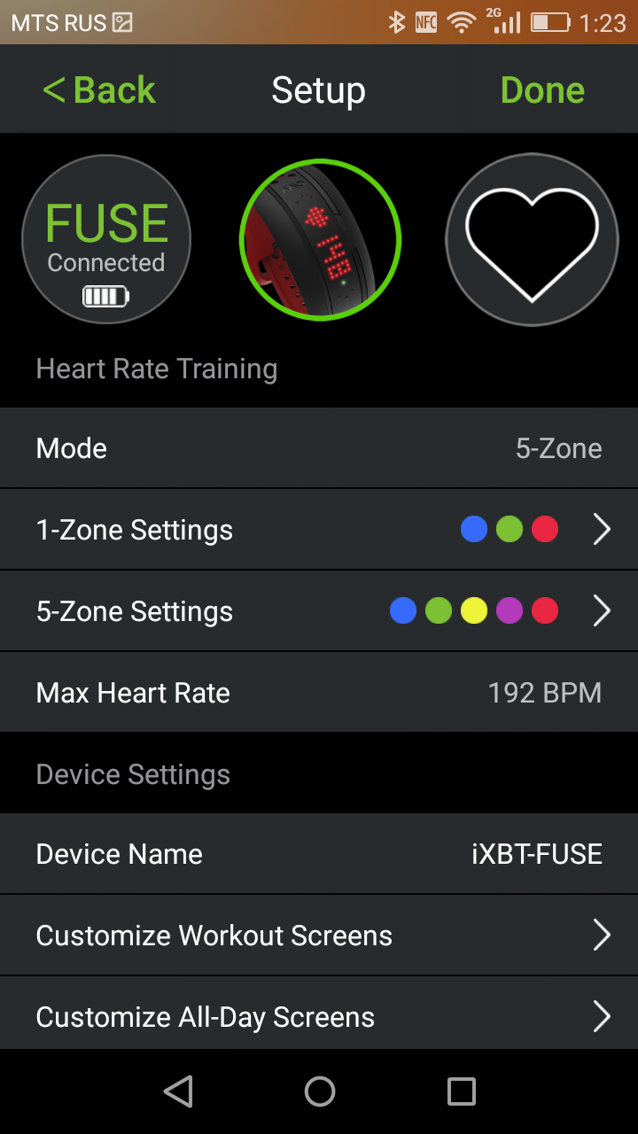 В настройках подсоединенного устройства мы можем задать дневные цели по активности, указать руку, на которой планируется носить браслет, включить или отключить вибрацию и настроить некоторые дополнительные параметры. Однако самая важная настройка — это зоны пульса. В приложении можно настроить границы каждой зоны: например, от 60 до 95 уд/м — обычный пульс, от 96 до 105 — «разогревочная» зона, далее — оптимальная зона для нагрузок...