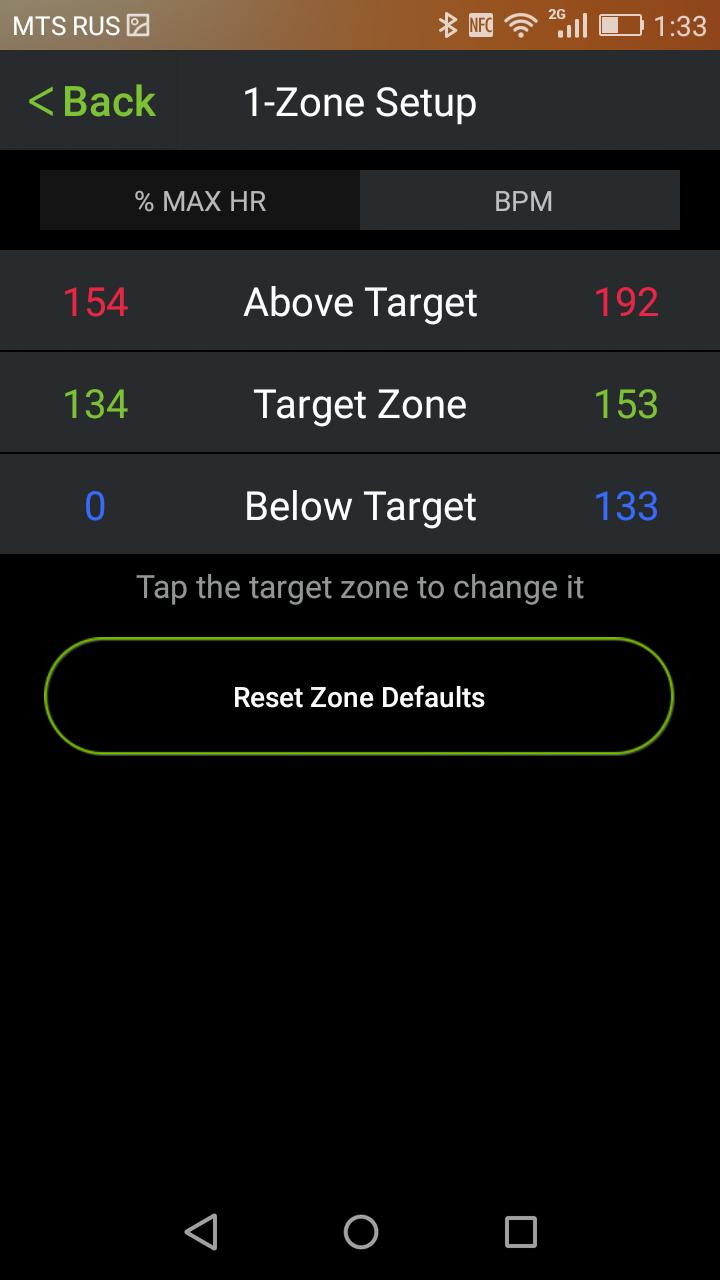 Здесь есть пятизонный режим (в нем, соответственно, 5 зон, оптимальная — третья и четвертая), есть однозонный (целевая зона — по умолчанию это от 134 до 153 уд/мин). Каждой зоне (а в случае с однозонным режимом — зонам пульса ниже и выше целевого) соответствует цветовой индикатор. Именно этим цветом будем мигать LED-светодиод на браслете при нахождении пульса в выбранной зоне.