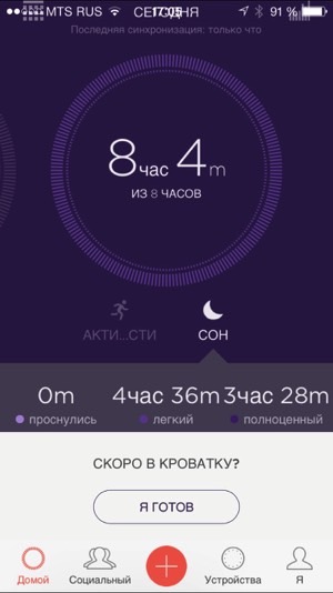 Как и полагается, браслет может отличать глубокий сон и легкий (поверхностный), причем делает это, судя по всему, весьма корректно. Важное достоинство — способность самостоятельно определять, когда пользователь лег спать. Правда, здесь браслет нередко допускает ошибки — например, не фиксирует дневной сон или считает, что в случае более-менее длительного пробуждения утром дальнейшего сна уже не было (а он на самом деле был).