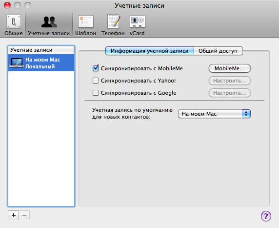 В прочем, если вы пользуетесь Маком, то окно веб-сервиса MobileMe вам можно вообще не открывать: просто используйте стандартные приложения Mac OS X (iCal, Адресная книга, Mail) для работы с контактами, расписанием и почтой MobileMe. А если вы хотите создать в Gallery фотоальбом или разместить на iDisc созданный вами сайт — используйте пакет iLife (в каждом приложении которого есть кнопочка MobileMe, нажав на которую, вы опубликуете созданные проекты в MobileMe). Скриншот, представленный ниже, снят с Адресной книги. На нем хорошо видно, как просто привязать Адресную книгу к MobileMe.