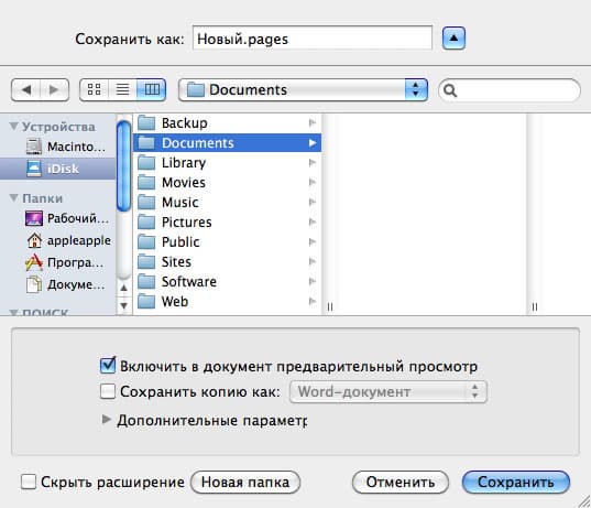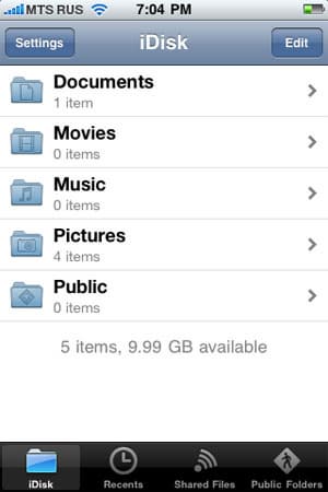 На данном скриншоте показано, как Apple iWork предлагает сохранить новый текстовый файл на iDisc. С тем же успехом мы могли бы сохранить его на Macintosh HD. При этом, для работы с iDisc не надо ничего настраивать, а логин и пароль достаточно ввести только при первом обращении. А если вы хотите получить доступ к сохраненным файлам со своего iPhone или iPod touch, надо установить клиент iDisc на мобильное устройство. Бесплатно скачать его можно с AppStore.