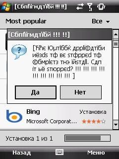 Еще из особенностей (не самых приятных) MarketPlace — это необходимость отвечать на множество лицензионных соглашений, предупреждений и т.п. Почему-то в App Store ничего подобного не требуется. Я уж не говорю о том, что за все время пользования App Store у меня никогда не было проблем со шрифтами. А вот при скачивании с Marketplace первое же приложение, которое я захотел установить (а это мобильная версия поисковика Microsoft Bing, то есть даже не сторонний софт), выдало мне вот такое сообщение (см. скриншот справа).