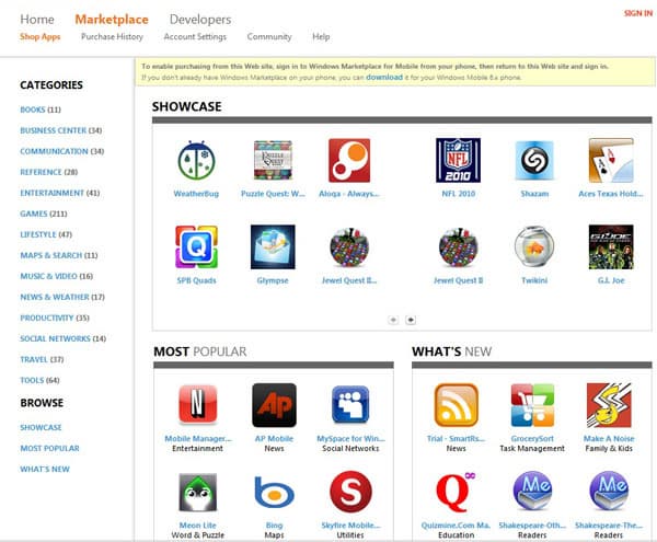 Если полезность My Phone для меня пока не так очевидна, то другое новшество Microsoft — MarketPlace — наверняка заинтересует всех пользователей устройств на базе Windows Mobile. Судите сами: раньше приложения для Windows Mobile приходилось искать на просторах интернета, заходя либо на сайты разработчиков, либо на специализированные ресурсы, посвященные Windows Mobile. Сделать это через мобильный телефон было практически невозможно (так как большинство сайтов не оптимизированы для КПК), да и при работе через компьютер возникало множество проблем (самая маленькая из которых — потеря времени, а самая большая — заражение вирусом при распаковке неизвестного архива, предположительно содержащего софт). На этом фоне сервис App Store выглядел очень выигрышно. А когда свой интернет-магазин программ запустила и Google, едва выпустив OS Android, положение Windows Mobile стало и вовсе печальным.